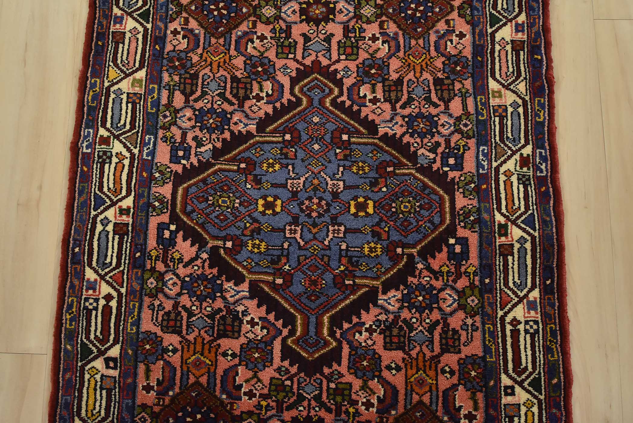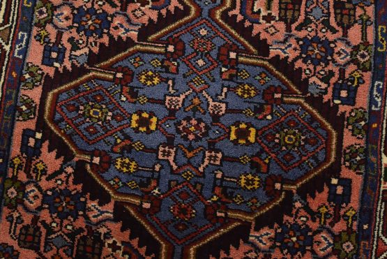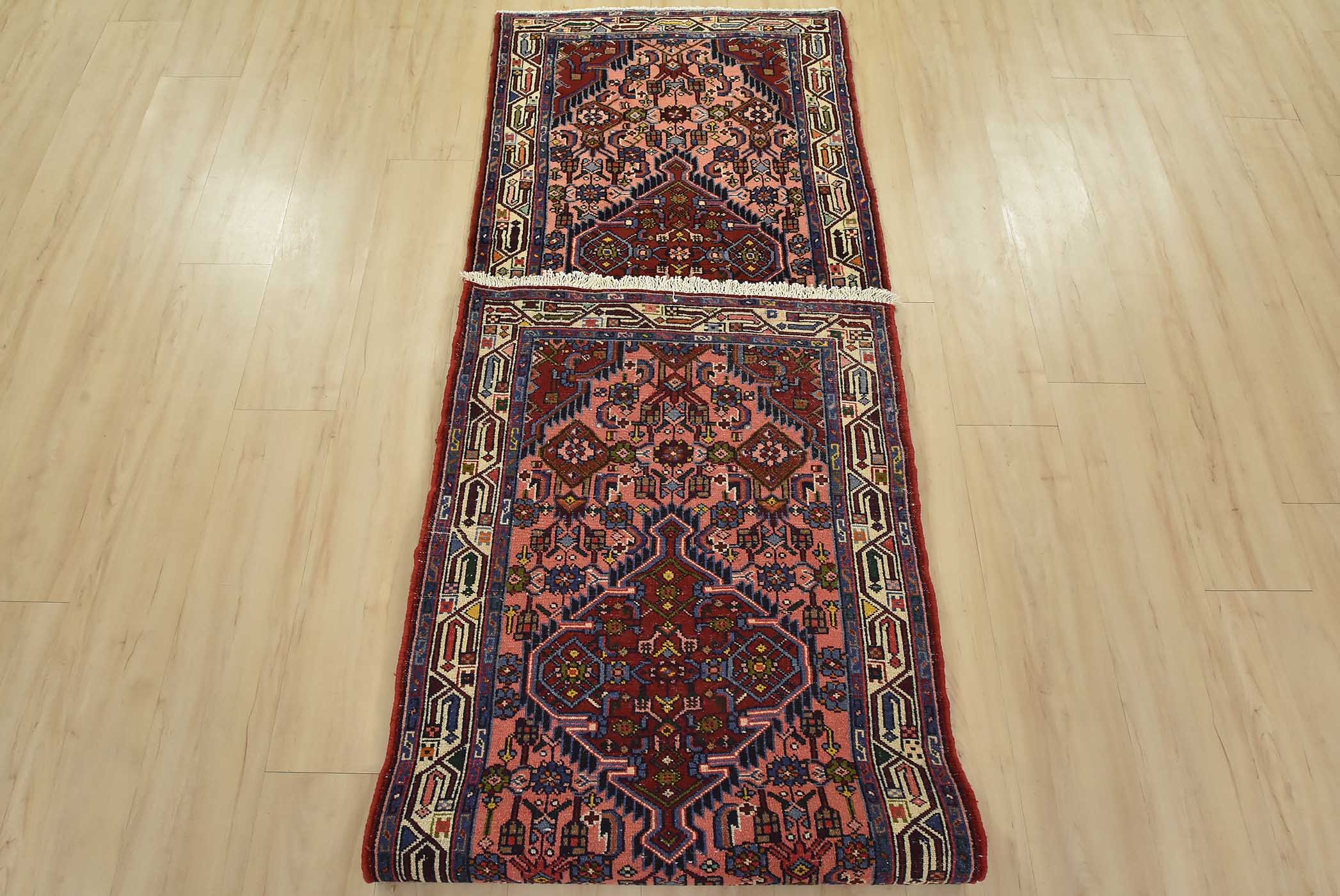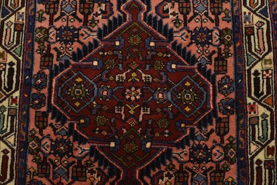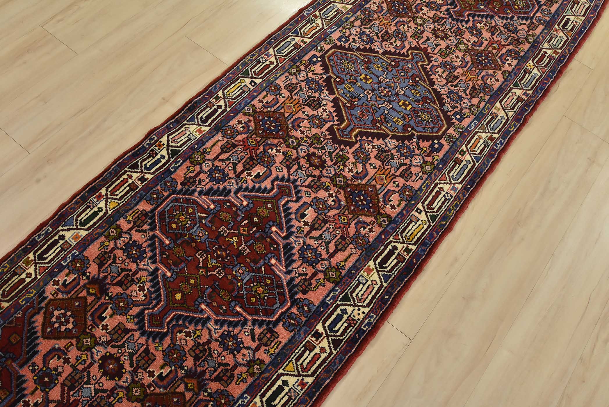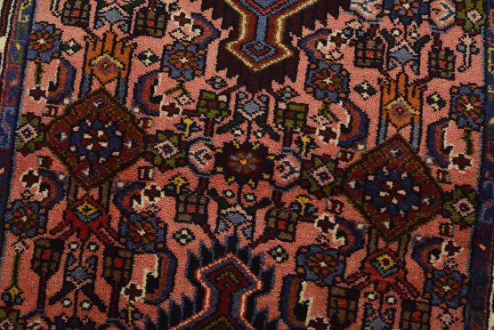 An authentic vintage tribal Hamedan runner hand-knotted with fine wool and natural dyes. This nomadic rug features a row of geometric medallions surrounded by a Herati pattern set against a pink background. It has a full wool pile with no worn areas and is in very good condition.