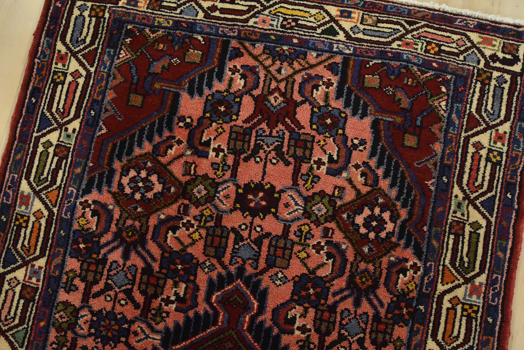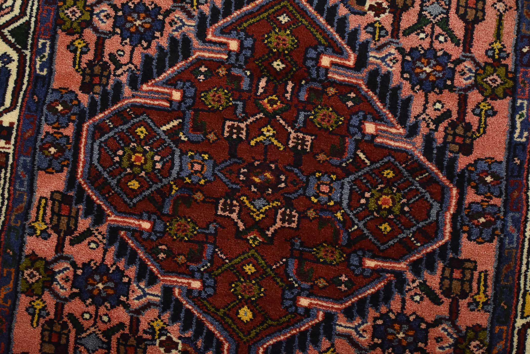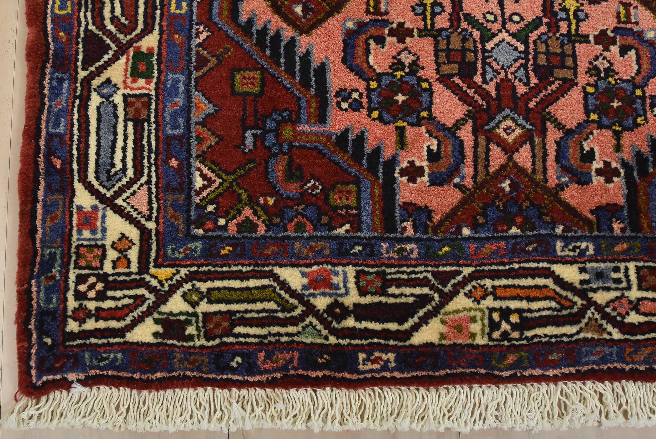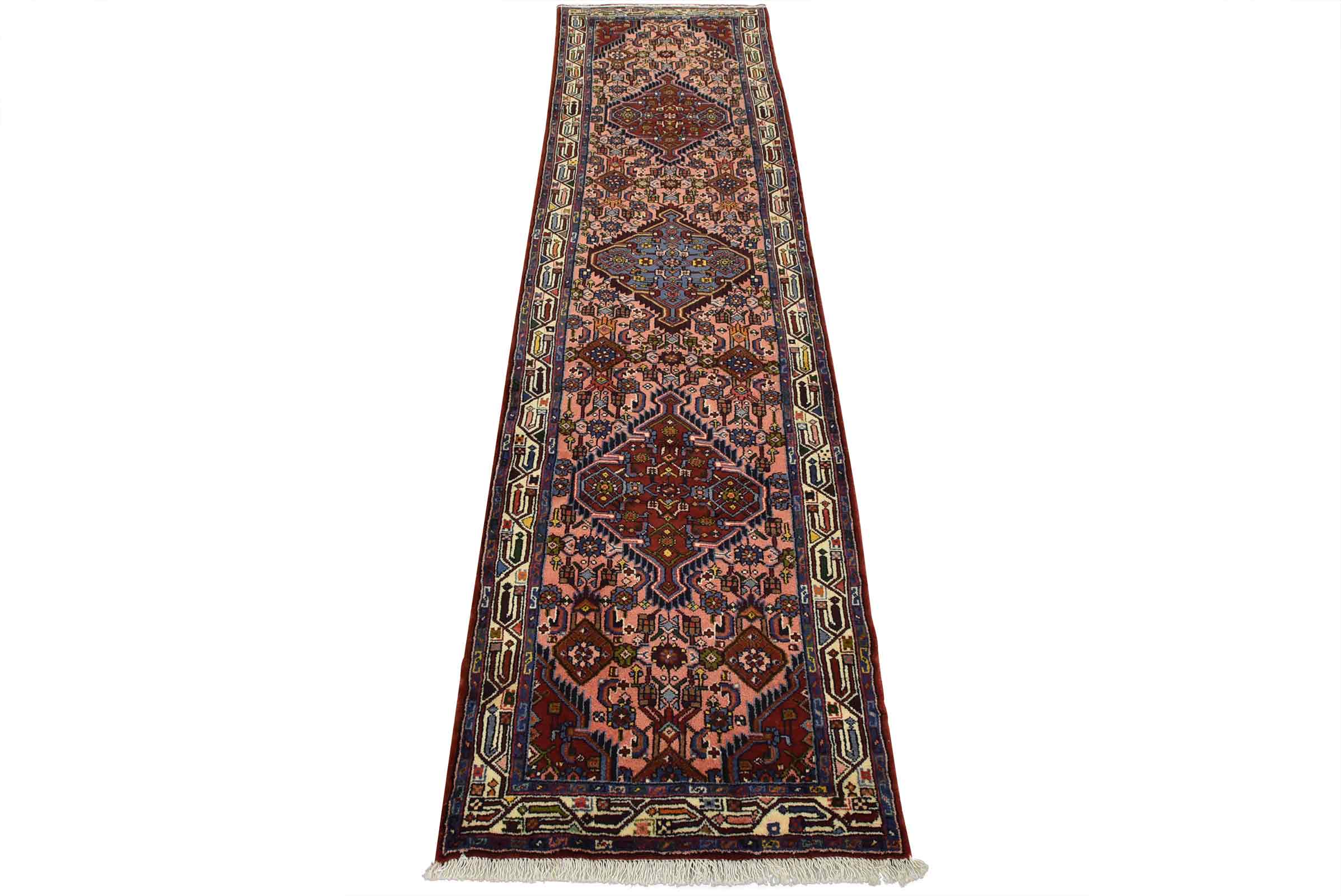 An authentic vintage tribal Hamedan runner hand-knotted with fine wool and natural dyes. This nomadic rug features a row of geometric medallions surrounded by a Herati pattern set against a pink background. It has a full wool pile with no worn areas and is in very good condition.