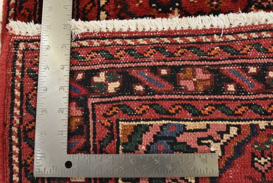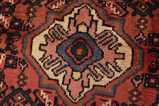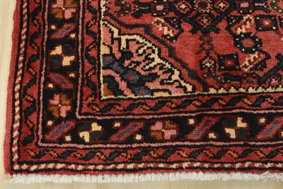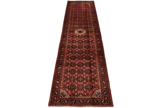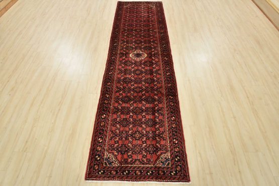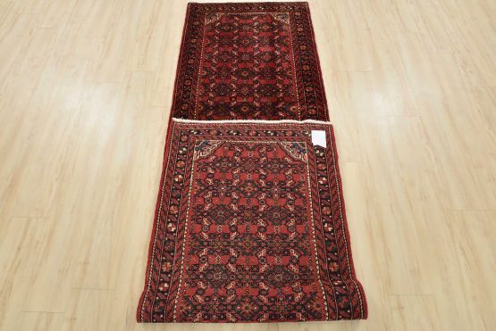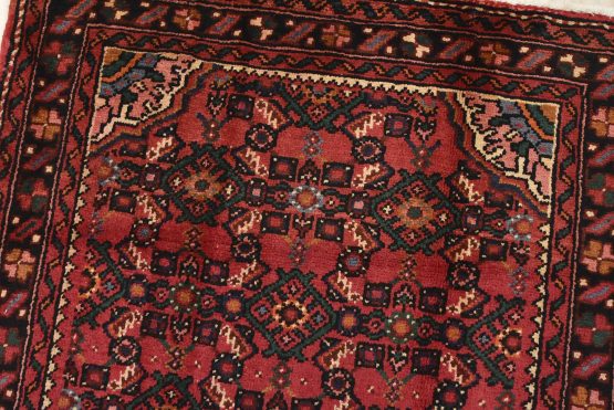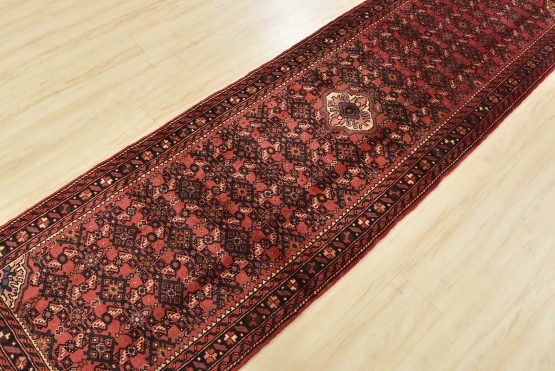 An authentic vintage tribal Hamedan runner hand-knotted with fine wool and natural dyes. This nomadic oriental rug features a central geometric medallion surrounded by a Herati pattern set against a red background. It has a full wool pile with no worn areas and is in very good condition.