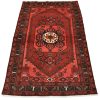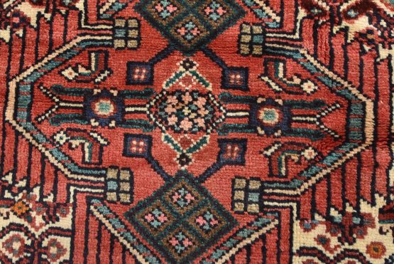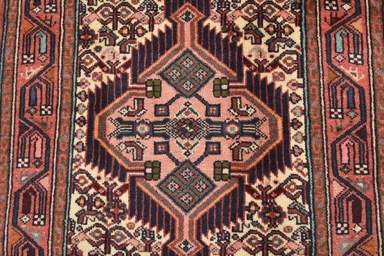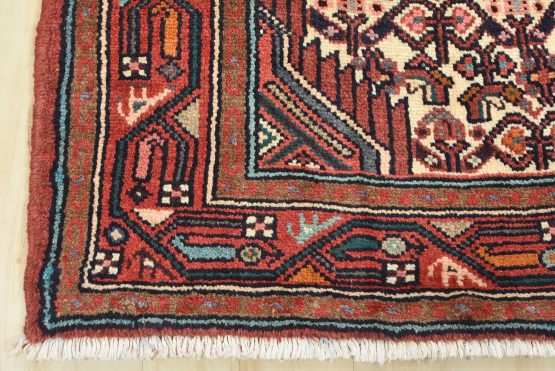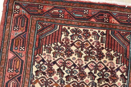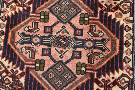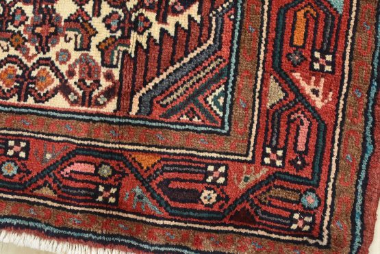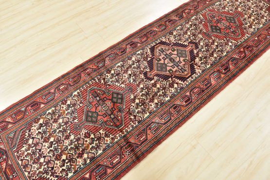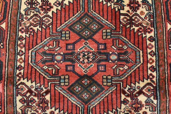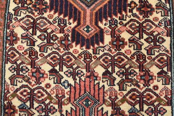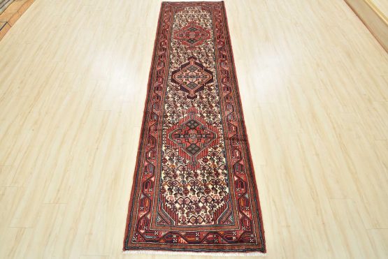 An authentic vintage tribal Hamedan runner hand-knotted with fine wool and natural dyes. This nomadic oriental rug features geometric medallions surrounded by a geometric pattern set against an ivory background. It has a full wool pile with no worn areas and is in very good condition.