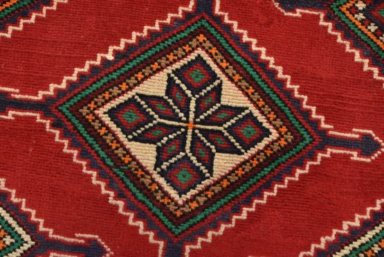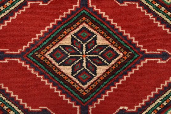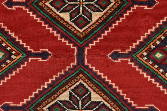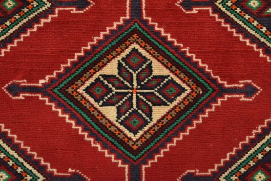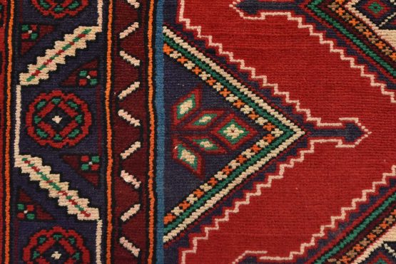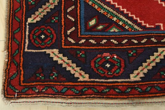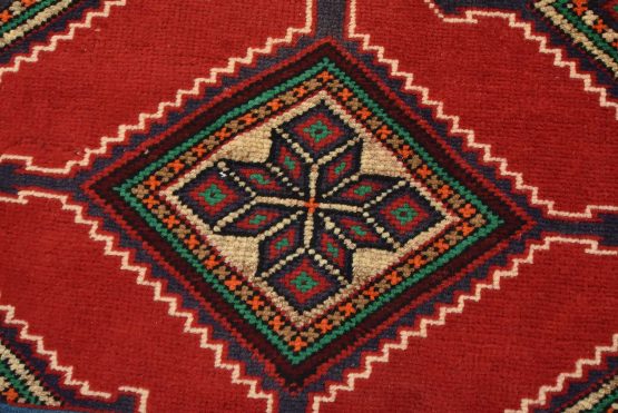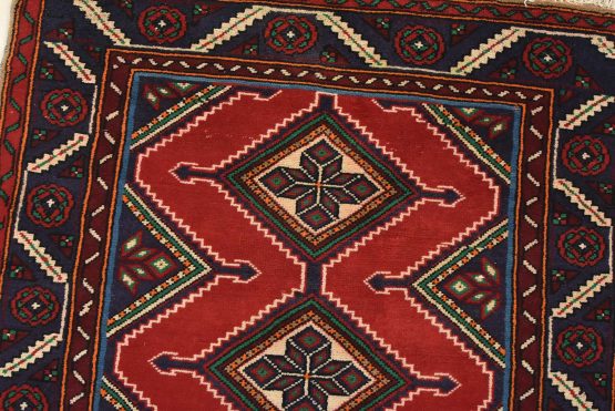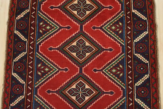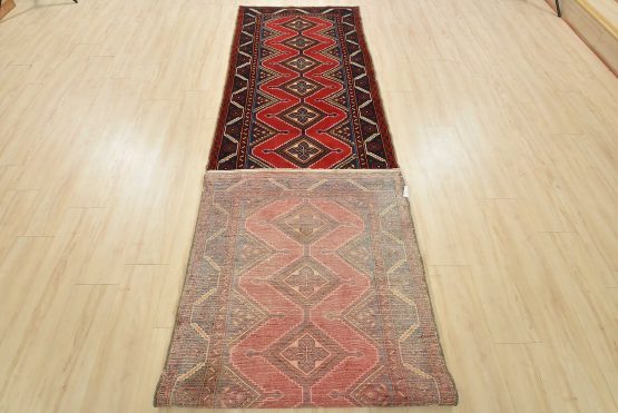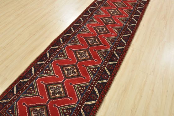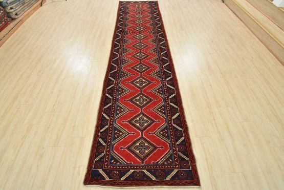 An authentic vintage tribal Hamedan runner hand-knotted with fine wool and natural dyes. This rug features a row of diamond-shaped medallions surrounded by other geometric patterns set against a red background. It has a full wool pile with no worn areas and is in very good condition.