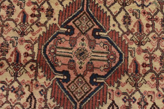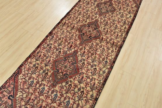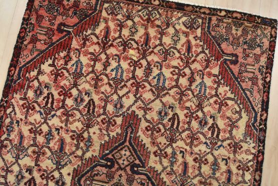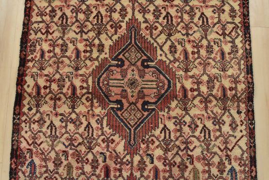 An authentic vintage tribal Hamedan runner hand-knotted with fine wool and natural dyes. This nomadic oriental rug features geometric medallions surrounded by a Boteh pattern set against an ivory background. The wool pile shows some minor wear; please refer to the photos. Otherwise, the rug is in very good condition.