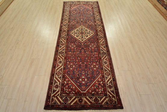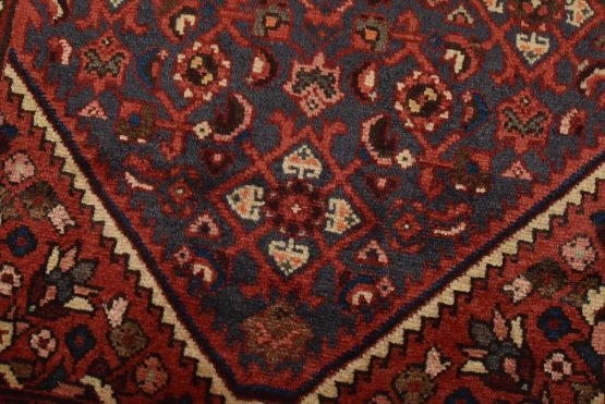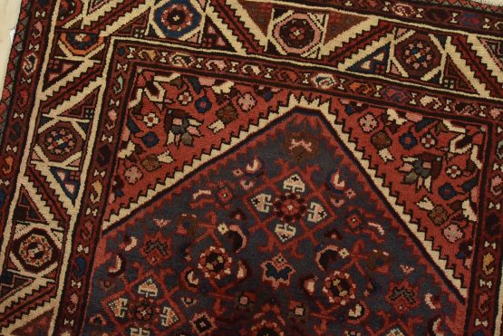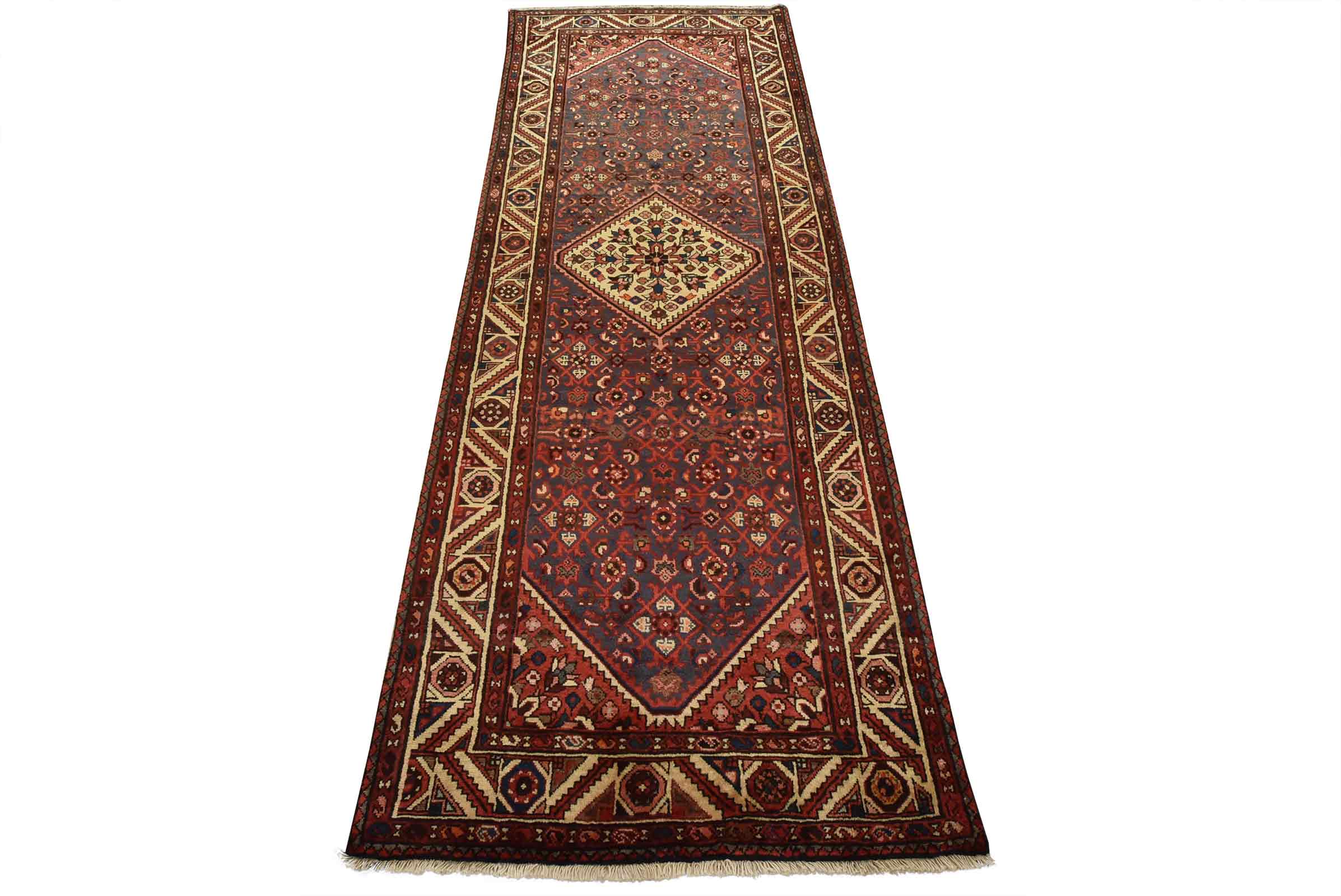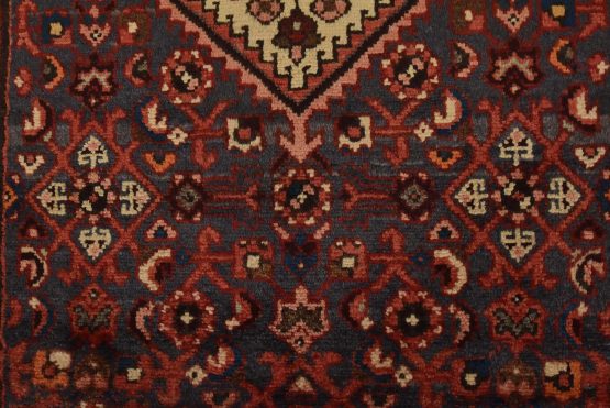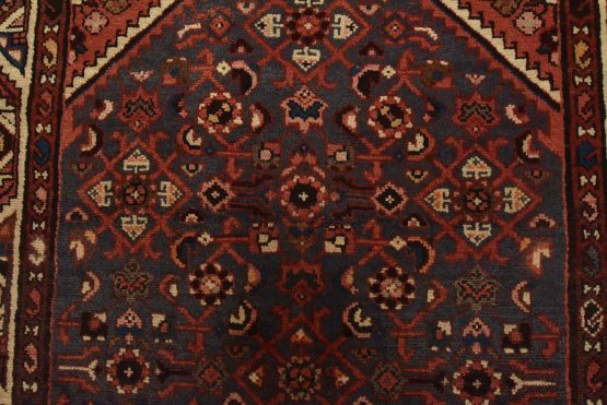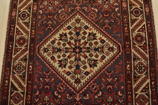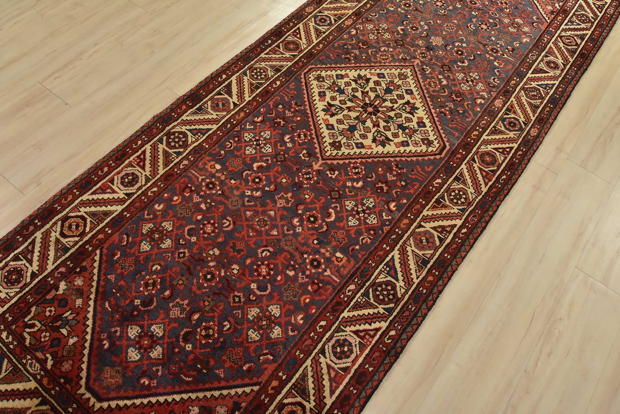 An authentic vintage tribal Hamedan runner hand-knotted with fine wool and natural dyes. This nomadic rug features a central medallion surrounded by a Herati pattern set against a blue background. It has a full wool pile with no worn areas and is in very good condition.