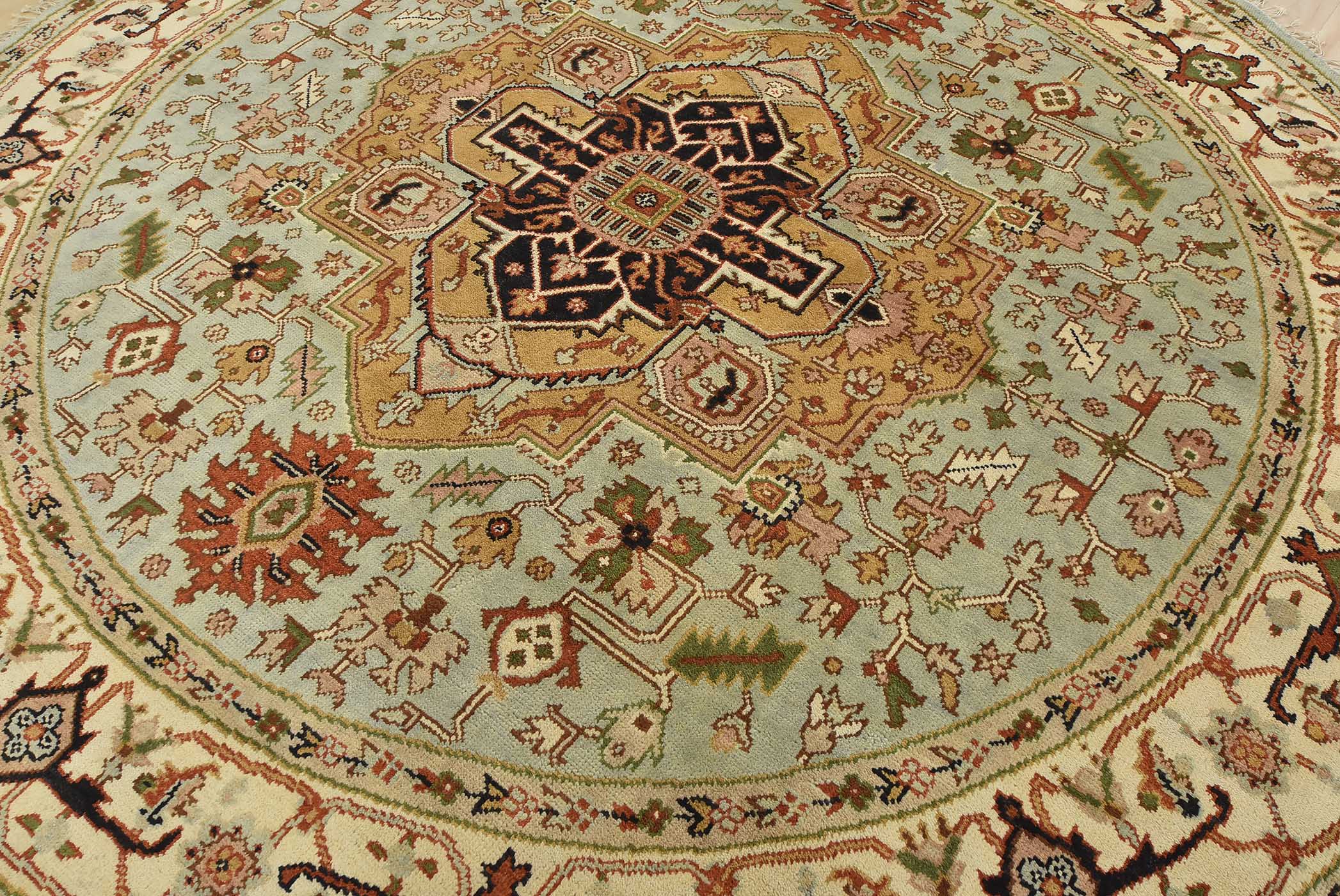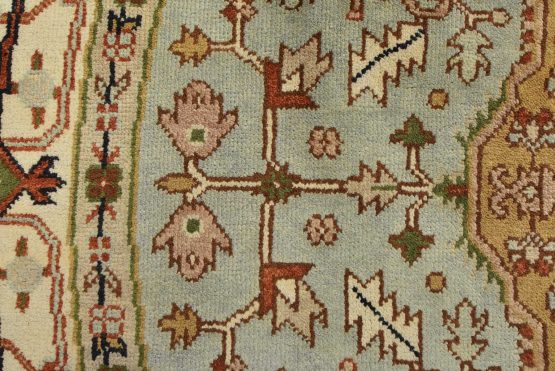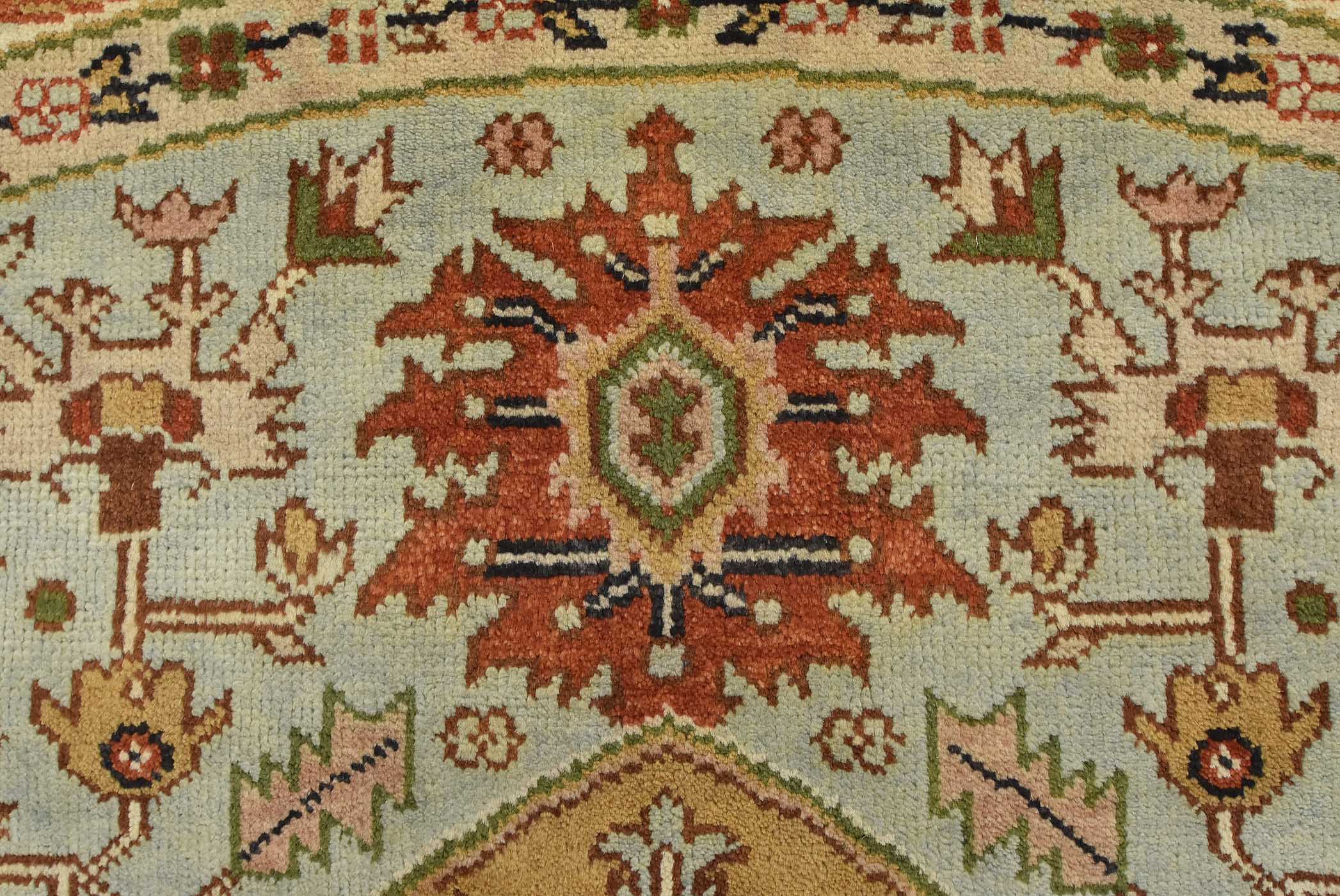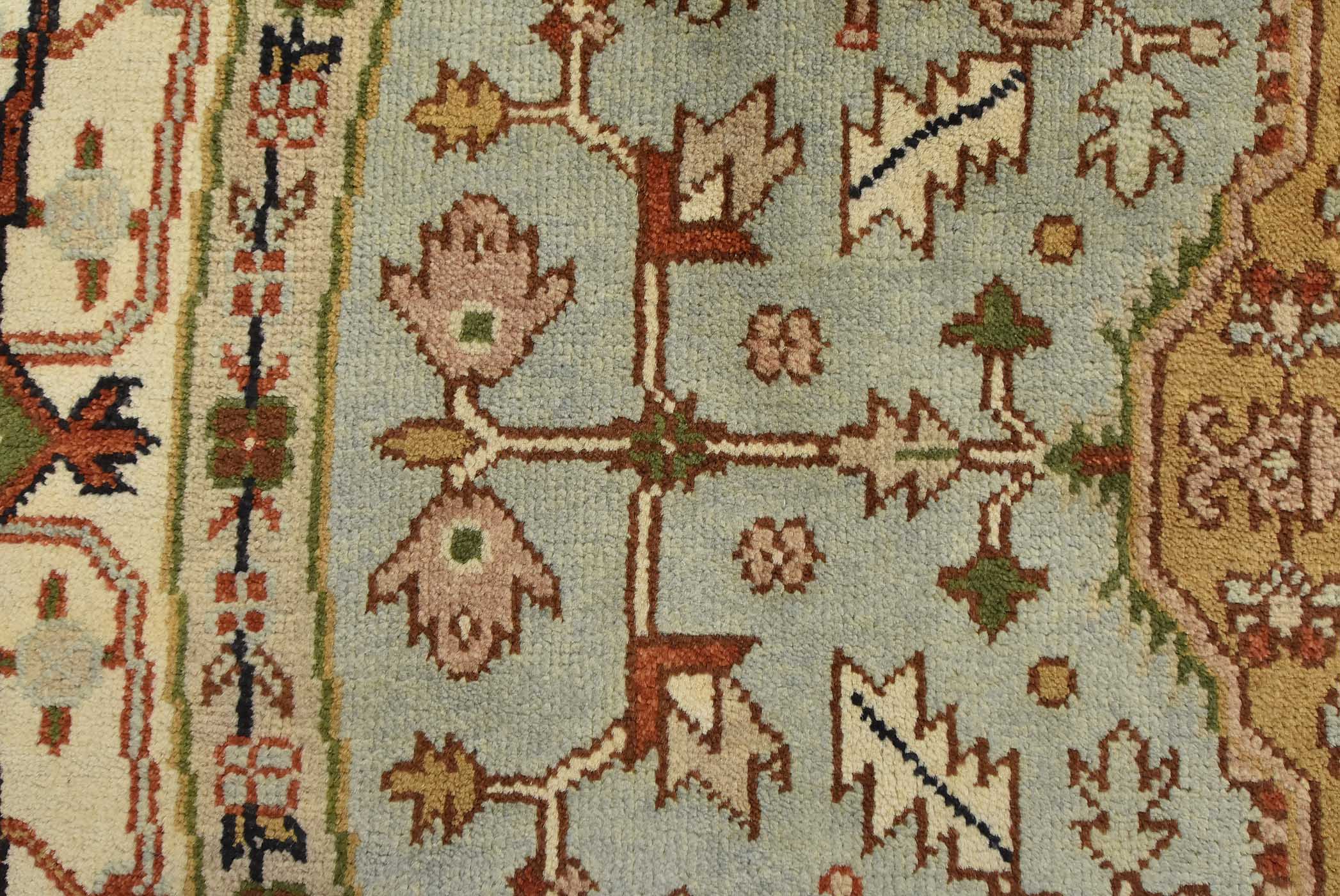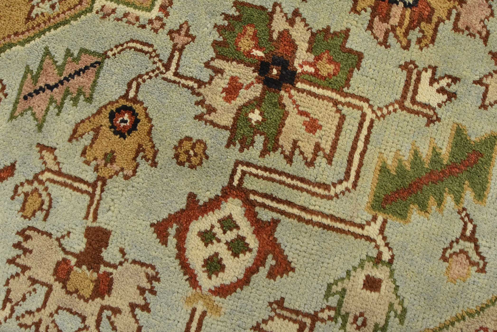 A traditional tribal Heriz rug hand-knotted with fine wool on a cotton foundation. This oriental rug features a central geometric medallion surrounded by botanical designs set against a light blue background. It is new and in excellent condition.