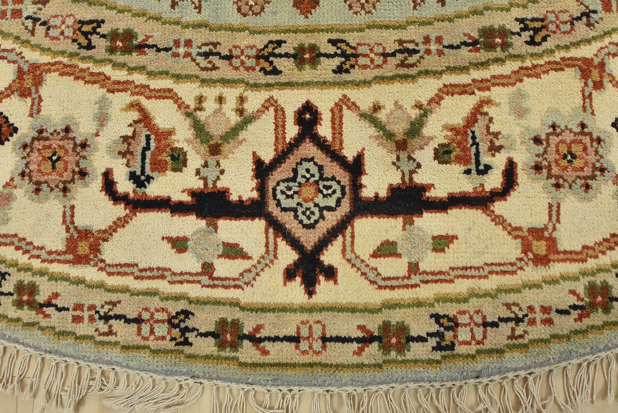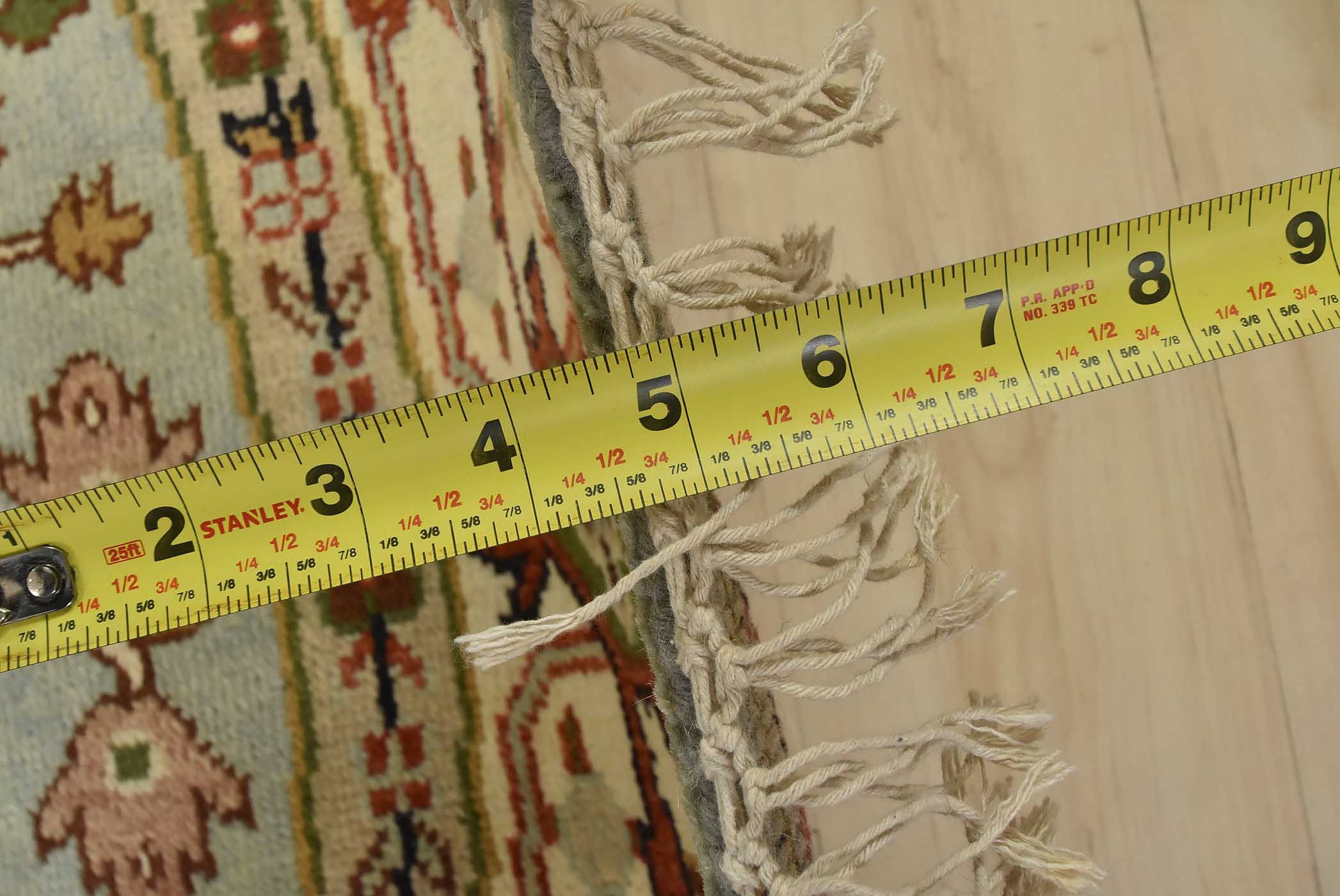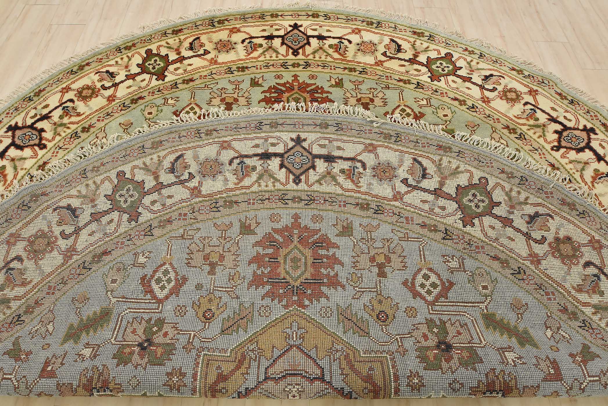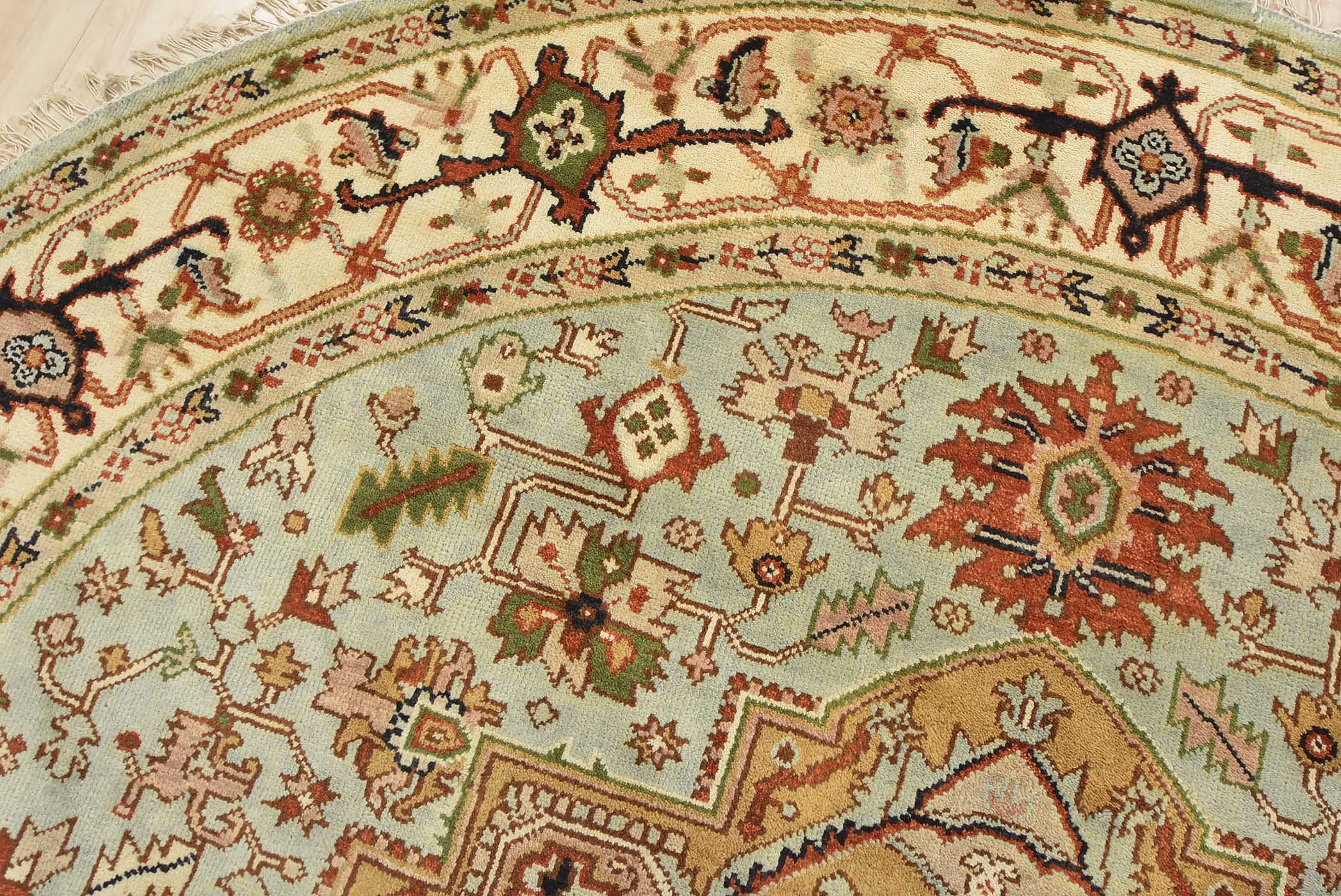 A traditional tribal Heriz rug hand-knotted with fine wool on a cotton foundation. This oriental rug features a central geometric medallion surrounded by botanical designs set against a light blue background. It is new and in excellent condition.