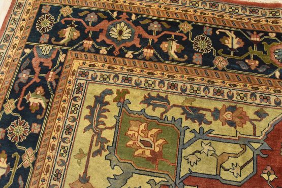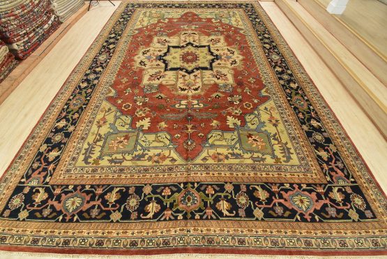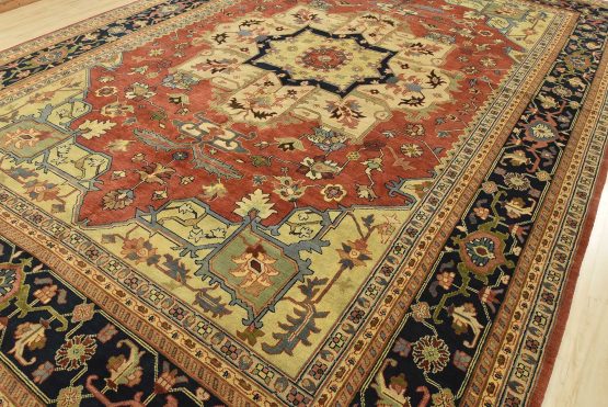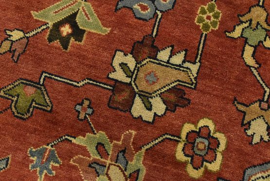 A traditional Heriz rug hand-knotted with an all-wool pile on a cotton foundation. This oriental rug features a central geometric medallion surrounded by a botanical design set against a rust-red background. It is new and in excellent condition.