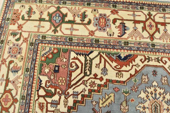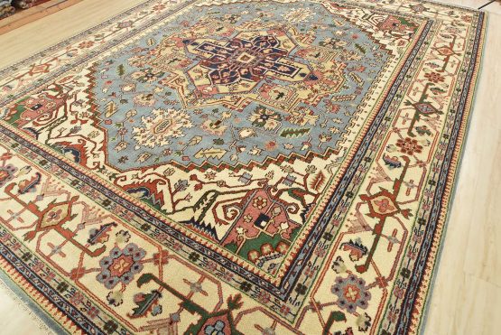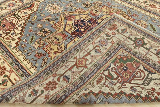 A traditional tribal Heriz rug hand-knotted with an all-wool pile on a cotton foundation. This oriental rug features a large central medallion surrounded by geometric botanical designs set against a light blue background. It is new and in excellent condition.