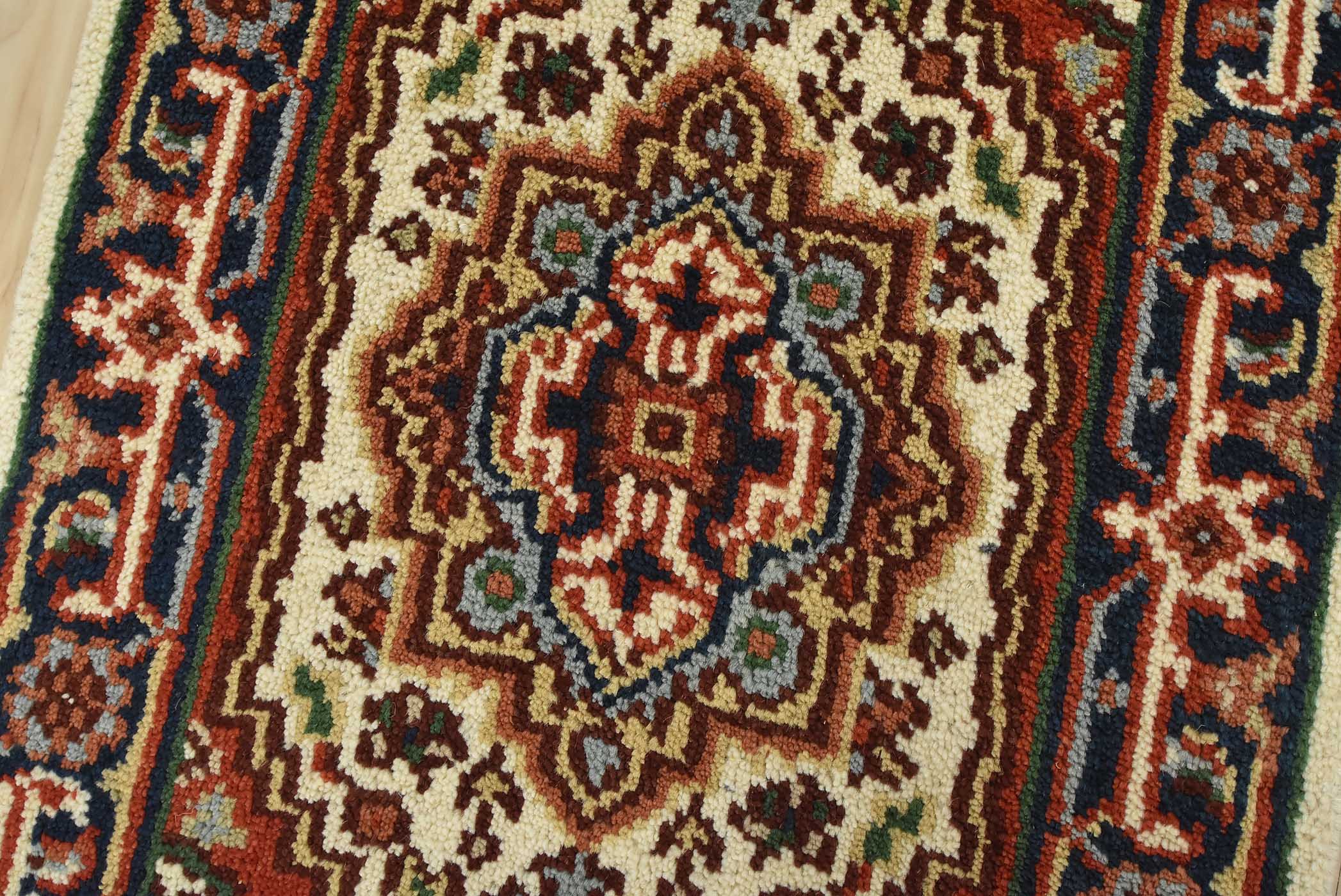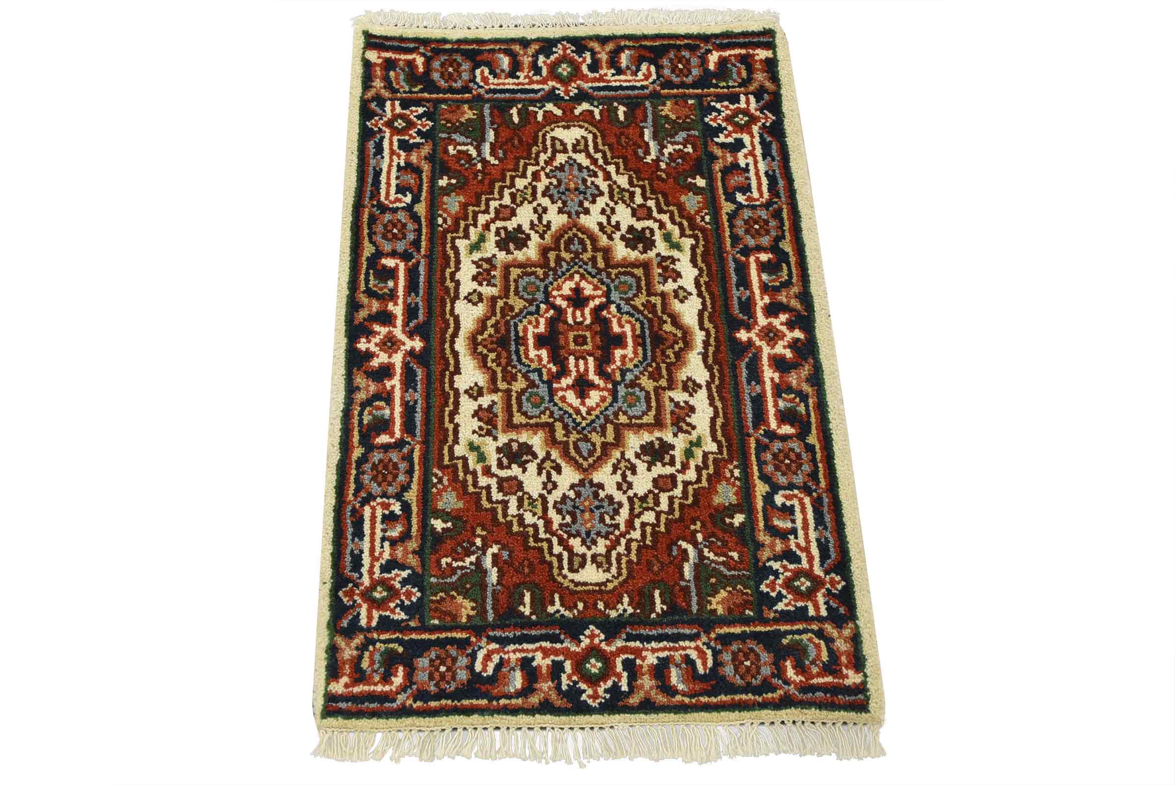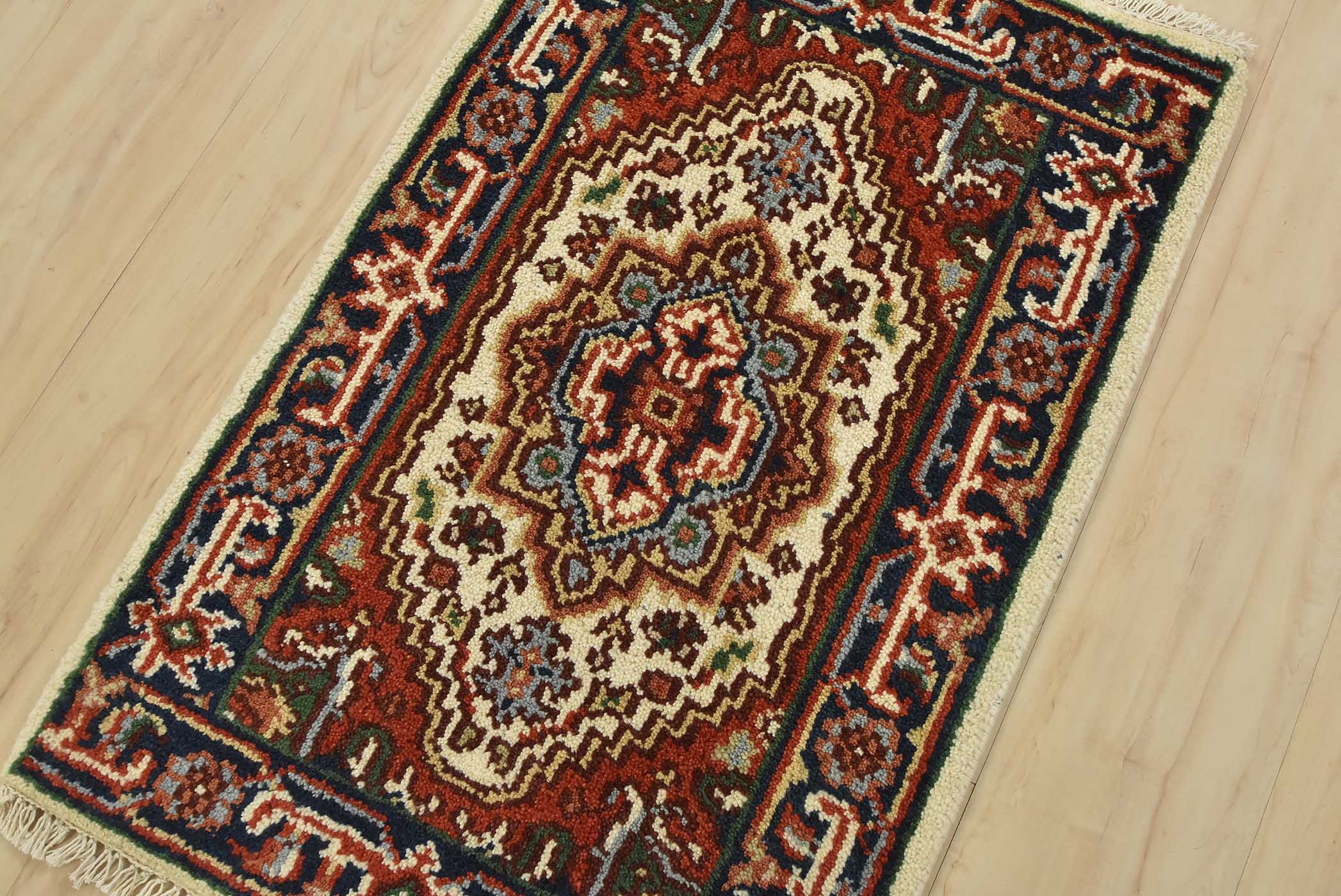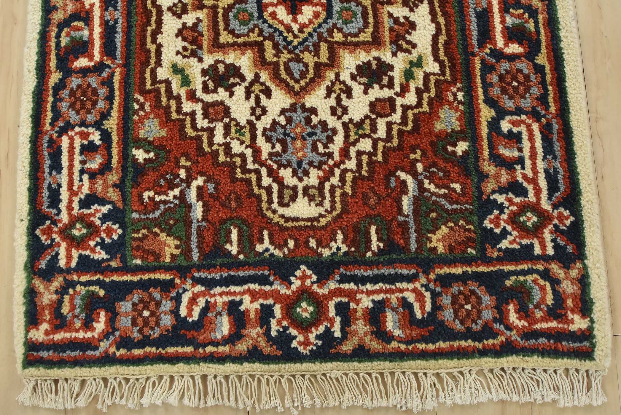 A traditional tribal Heriz rug hand-knotted with fine wool on a cotton foundation. This oriental rug features a central medallion surrounded by botanical motifs set against an Ivory background. It is new and in excellent condition.