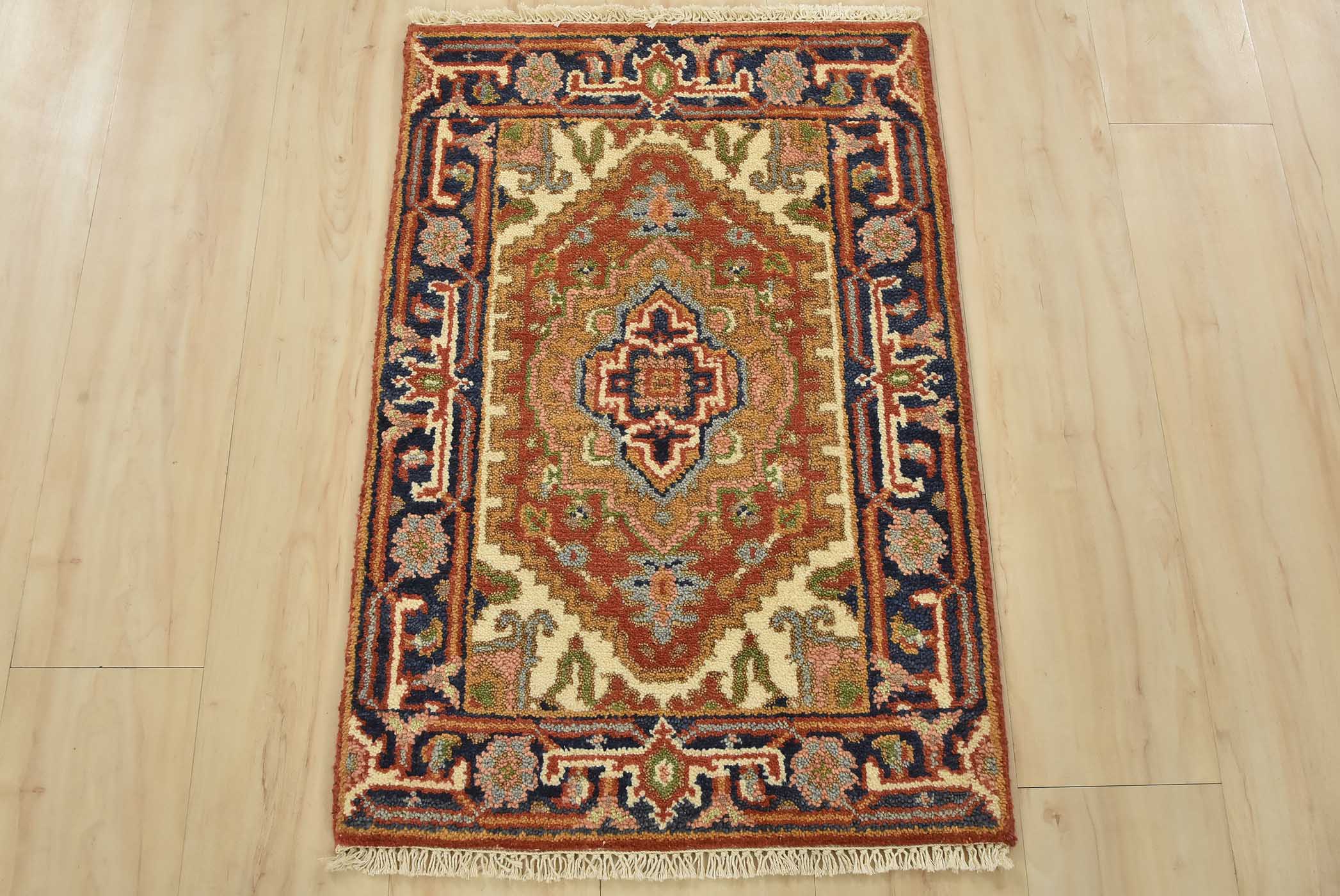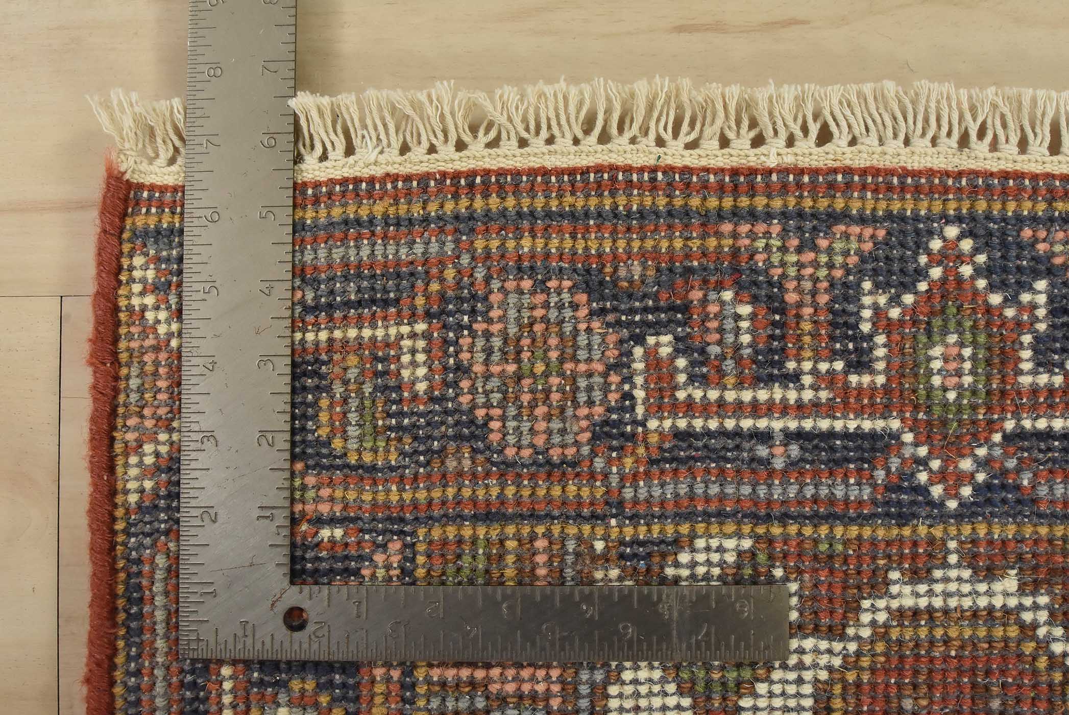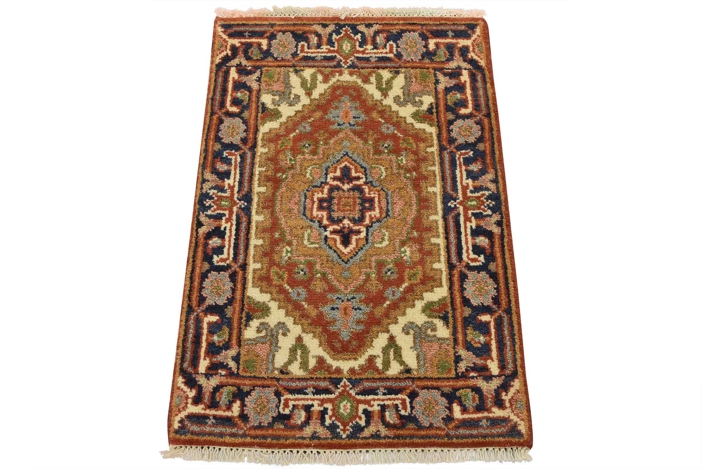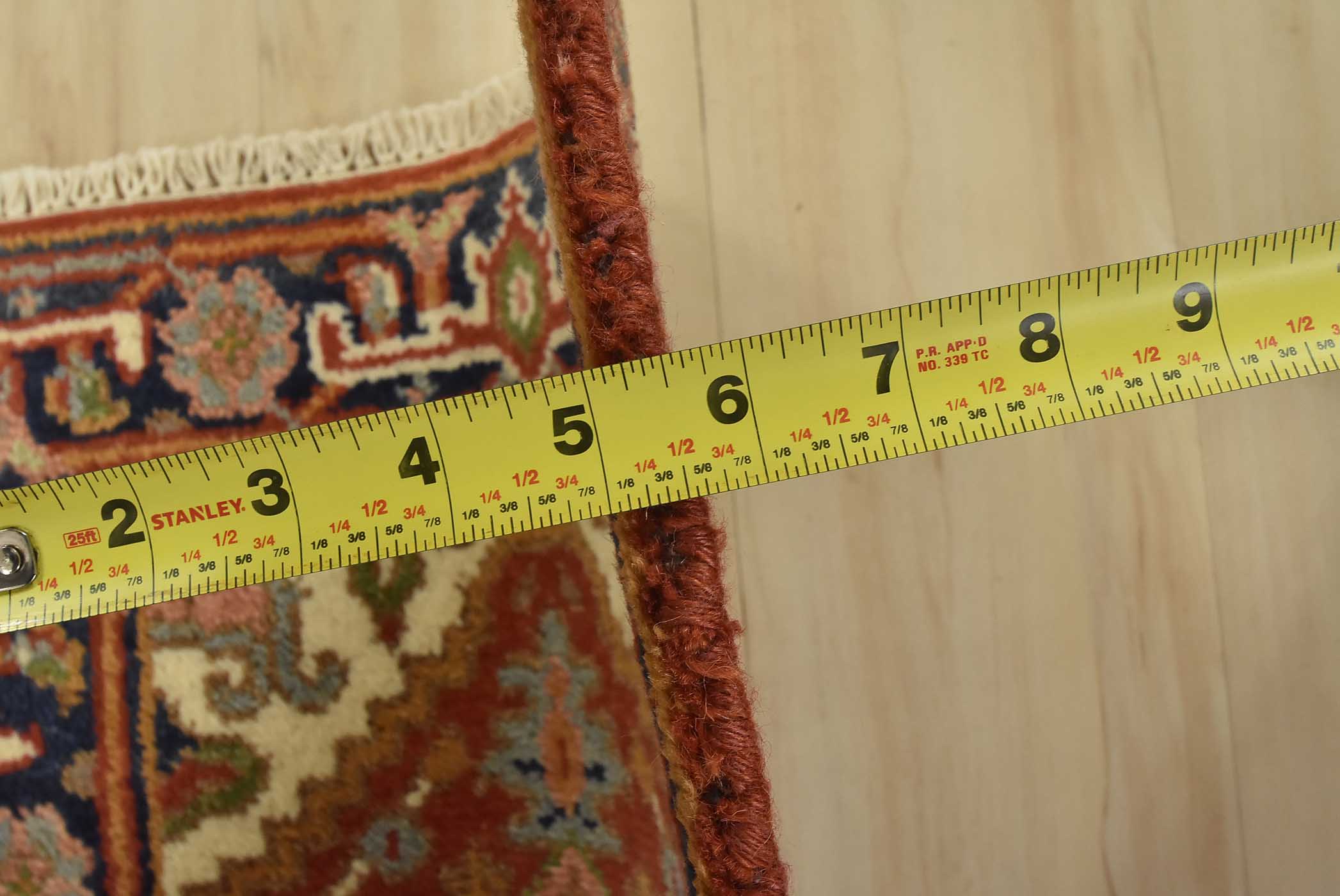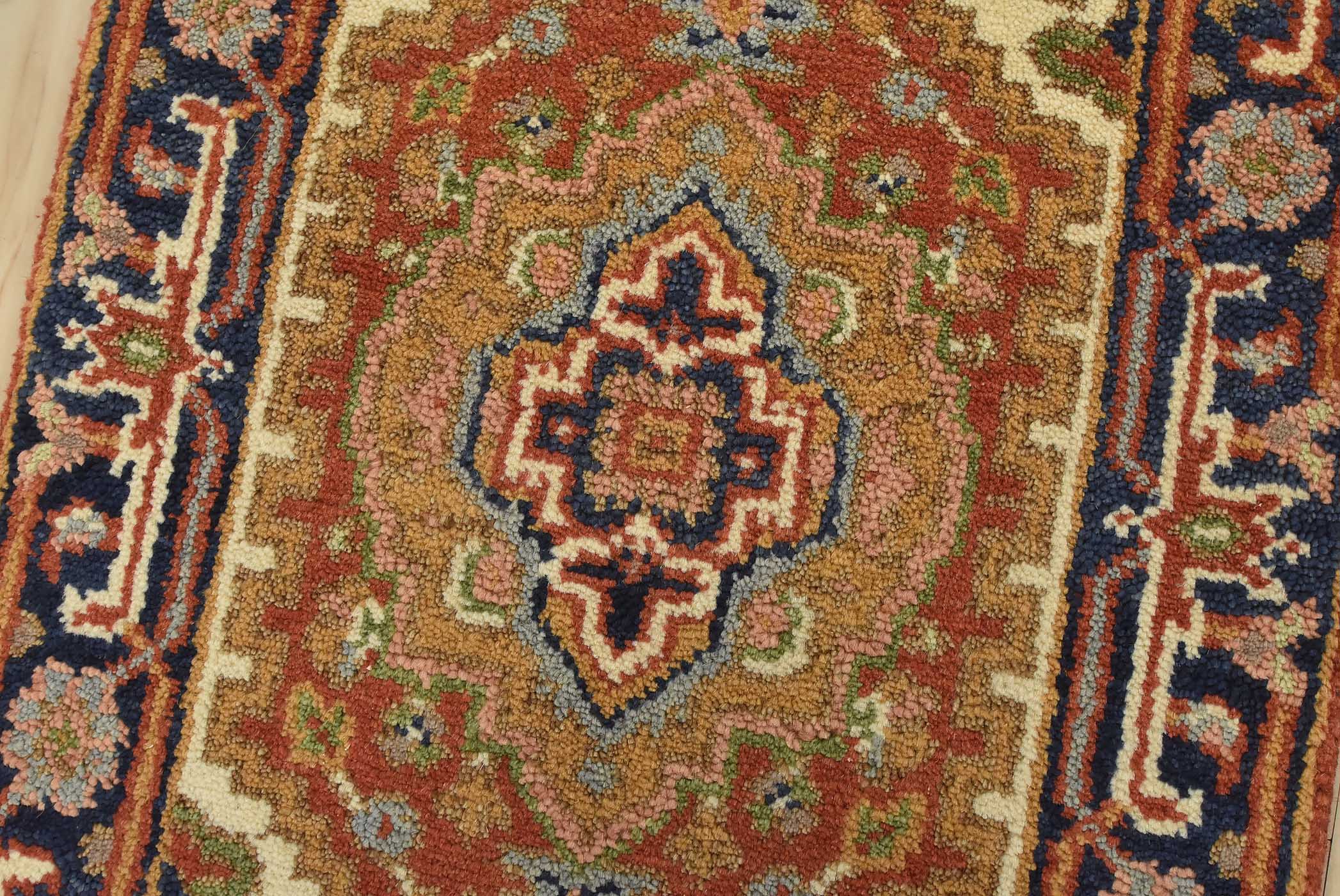 A traditional tribal Heriz rug hand-knotted with fine wool on a cotton foundation. This oriental rug features a central medallion surrounded by botanical motifs set against a rust background. It is new and in excellent condition.