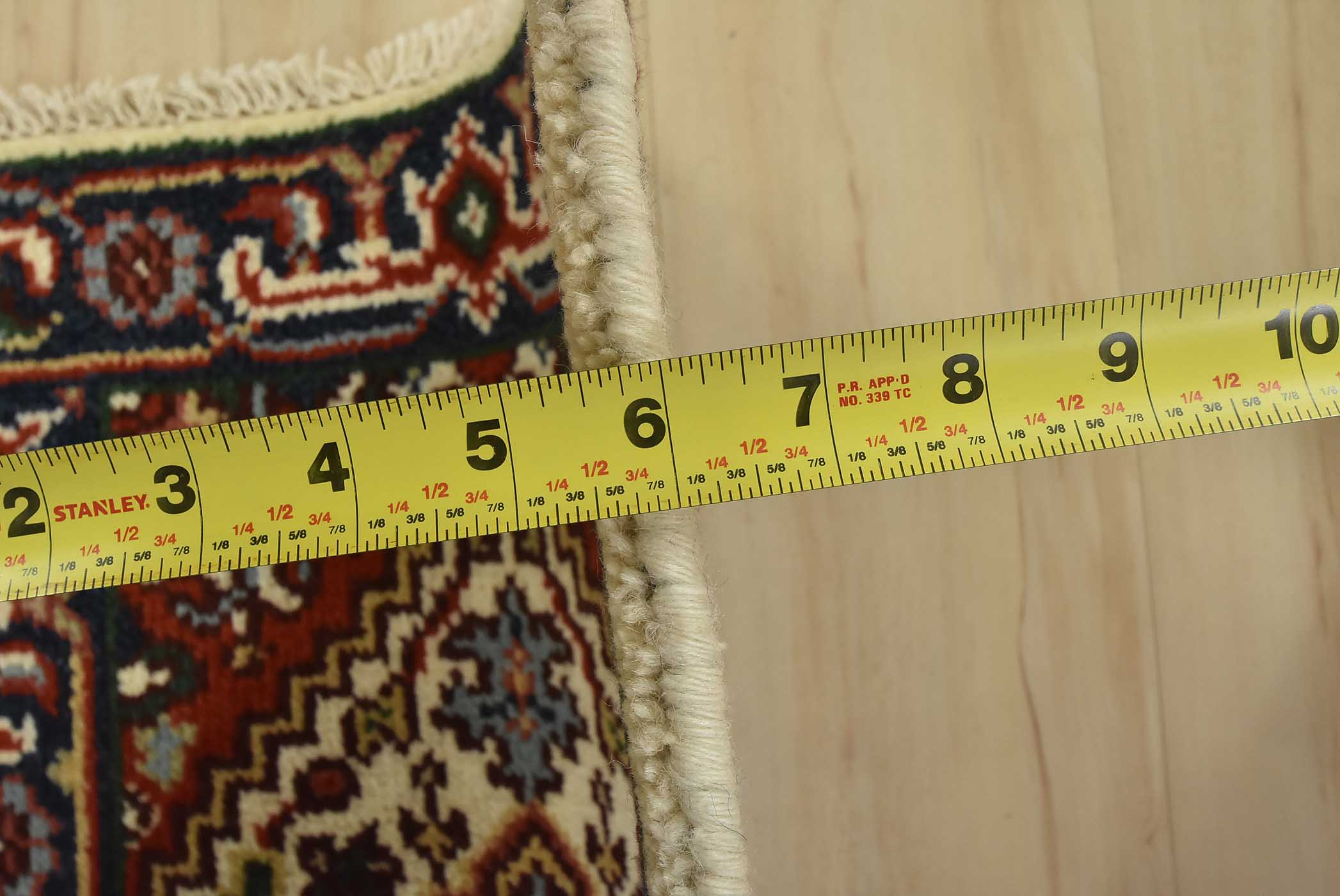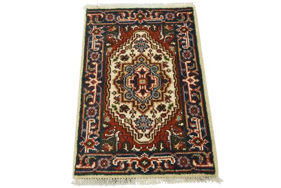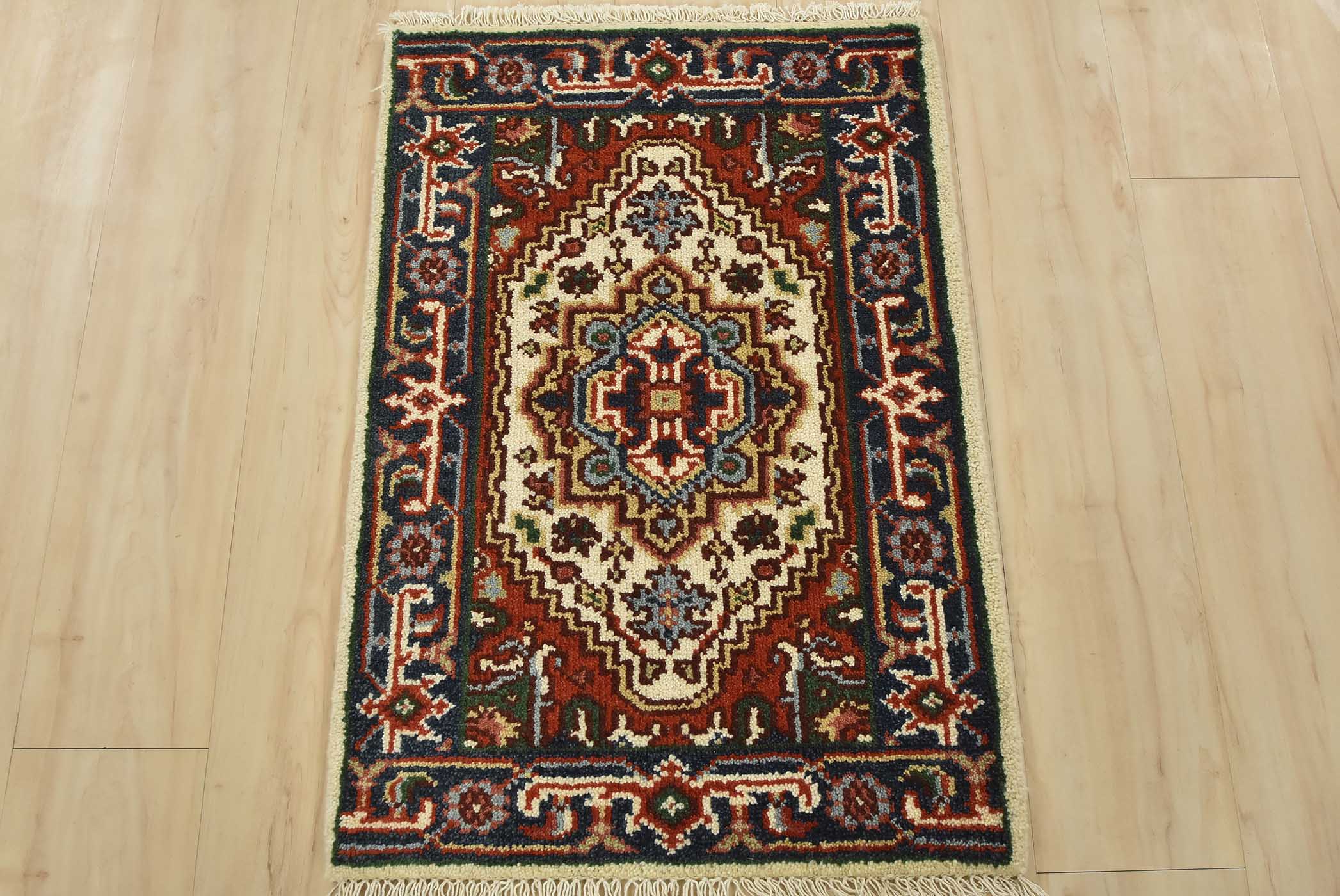 A traditional tribal Heriz rug hand-knotted with fine wool on a cotton foundation. This oriental rug features a central medallion surrounded by botanical motifs set against an Ivory background. It is new and in excellent condition.