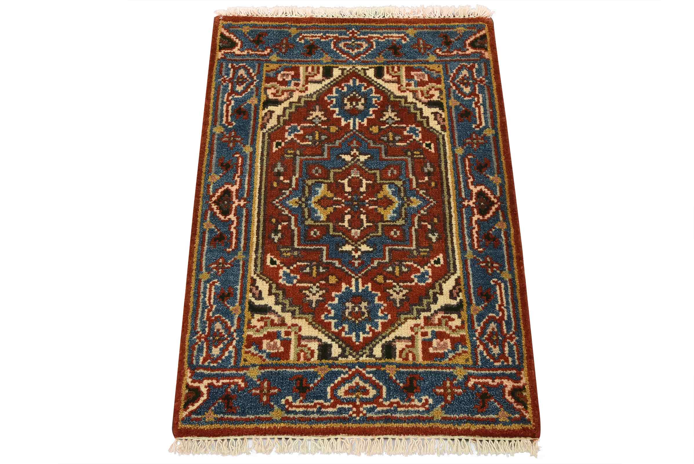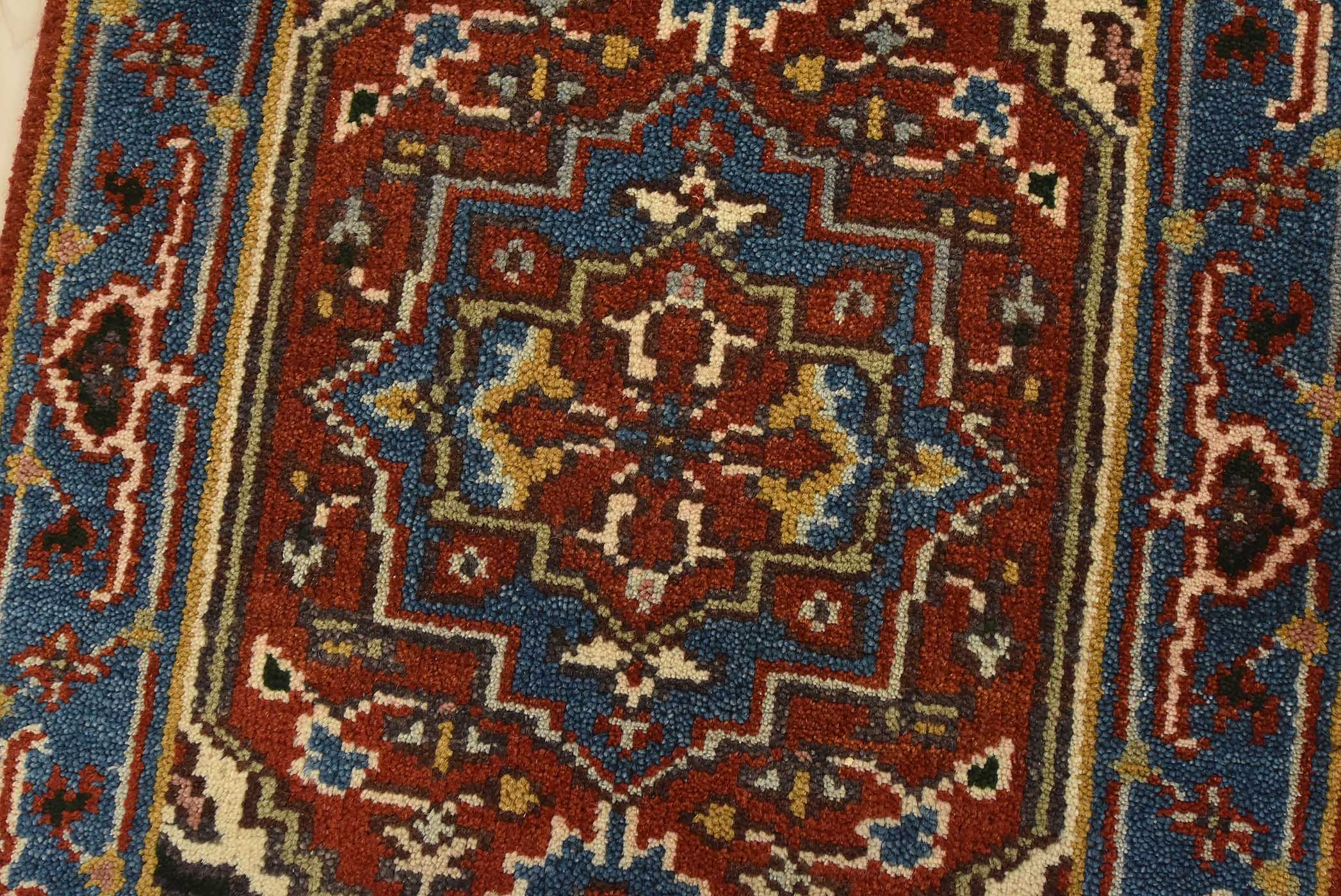 A traditional tribal Heriz rug hand-knotted with fine wool on a cotton foundation. This oriental rug features a central medallion surrounded by botanical motifs set against a red background. It is new and in excellent condition.