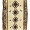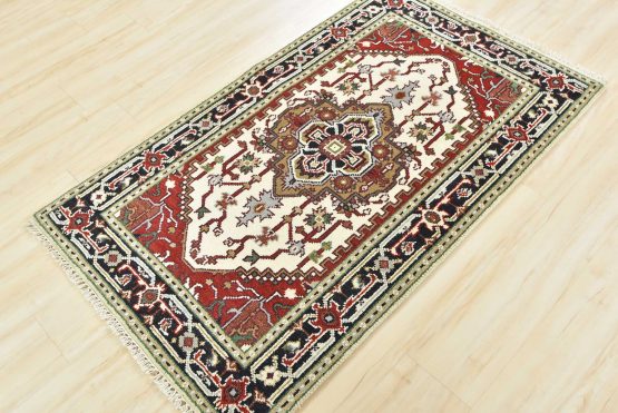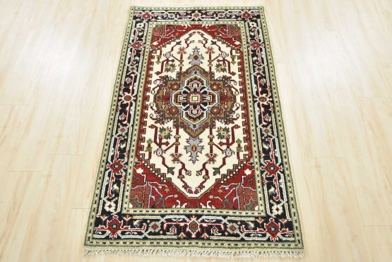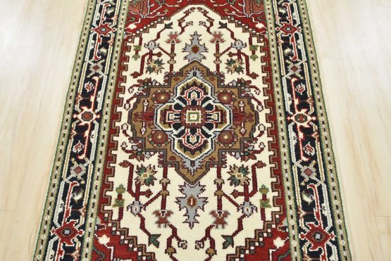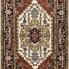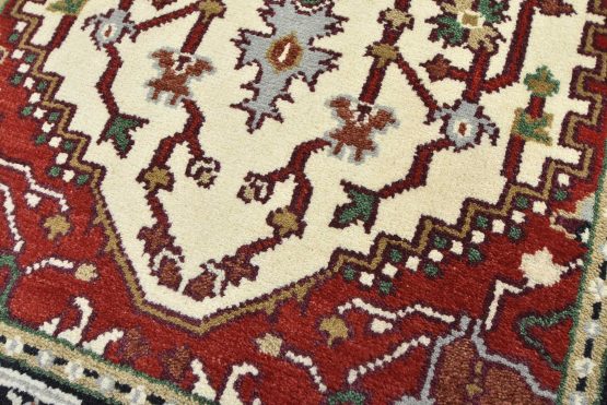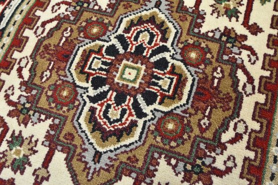 A traditional tribal Heriz rug hand-knotted with an all-wool pile on a cotton foundation. This oriental rug features a central geometric medallion surrounded by a botanical design set against an ivory background. It is new and in excellent condition.
