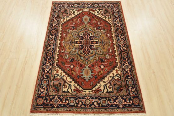 A traditional tribal Heriz rug hand-knotted with an all-wool pile on a cotton foundation. This oriental rug features a central geometric medallion surrounded by a botanical design set against a red background. It is new and in excellent condition.