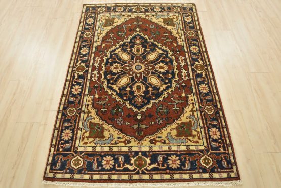 A traditional tribal Heriz rug hand-knotted with an all-wool pile on a cotton foundation. This oriental rug features a central medallion surrounded by botanical designs set against a red background. It is new and in excellent condition.