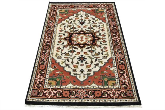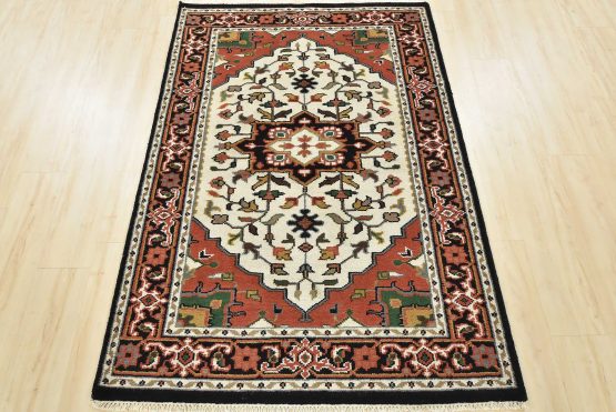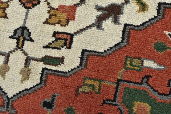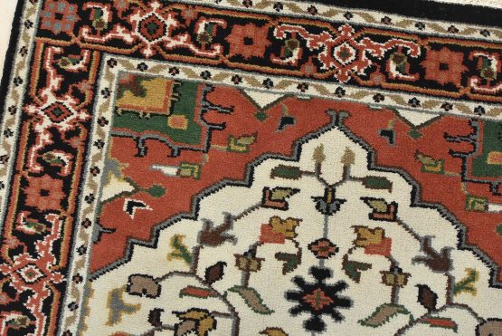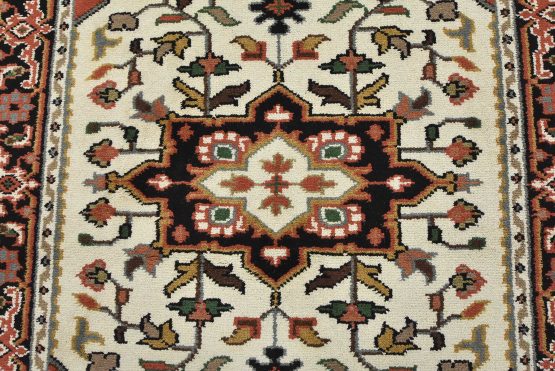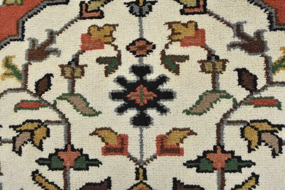 A traditional Heriz rug hand-knotted with an all-wool pile on a cotton foundation. This oriental rug features a central geometric medallion surrounded by a botanical design set against an ivory background. It is new and in excellent condition.