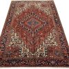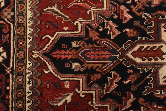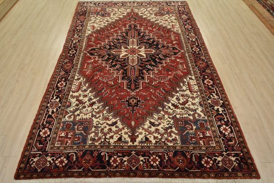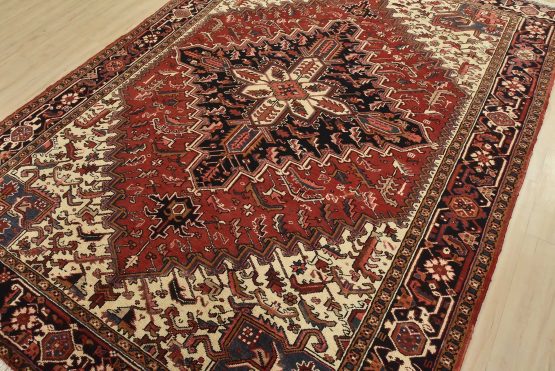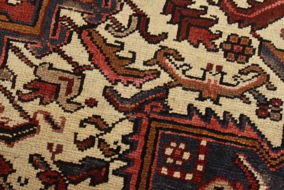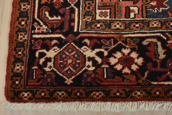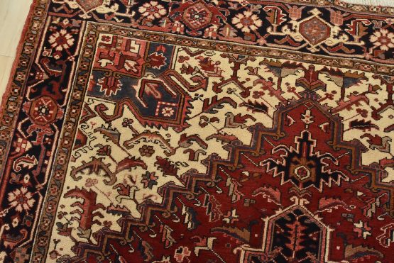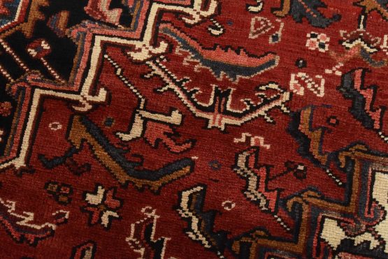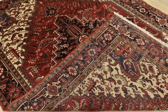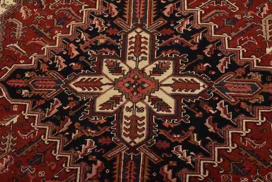An authentic vintage traditional tribal Heriz rug hand-knotted with fine wool and natural dyes. This nomadic oriental rug features a central geometric medallion surrounded by geometric botanical designs set against a red background. It has a full wool pile with no worn areas and is in very good condition.