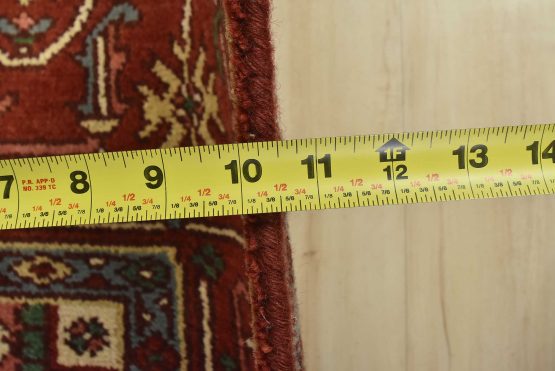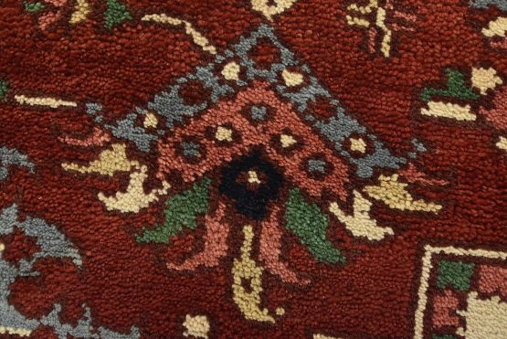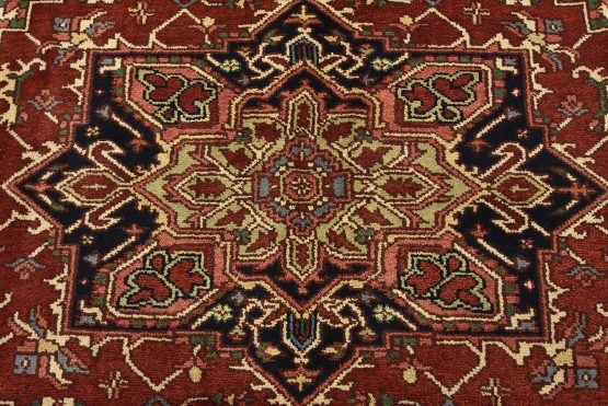 A traditional tribal Heriz rug hand-knotted with an all-wool pile on a cotton foundation. This oriental rug features a central geometric medallion surrounded by geometric botanical designs set against a red background. It is new and in excellent condition.