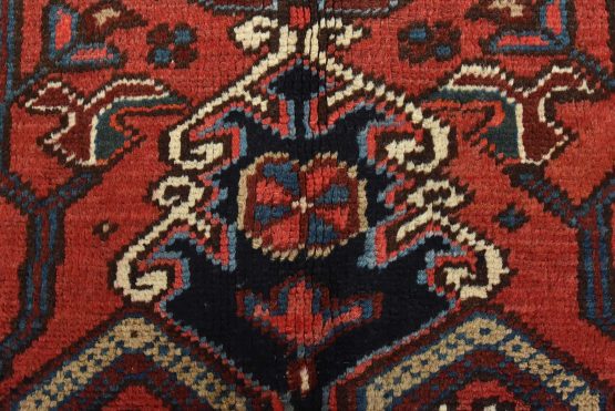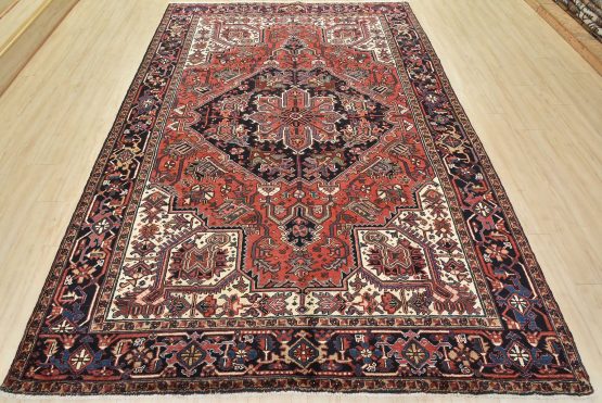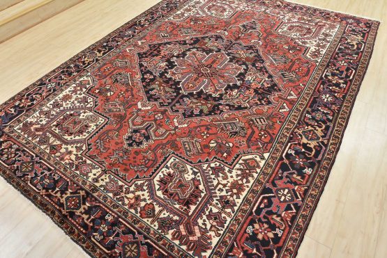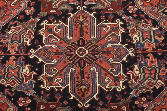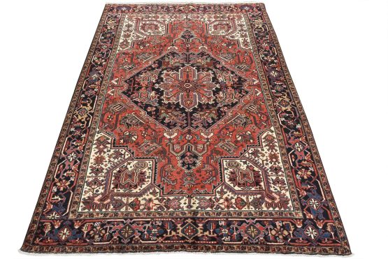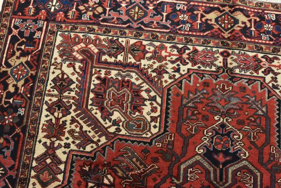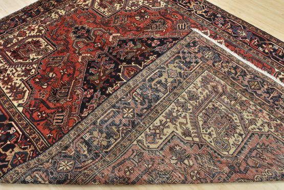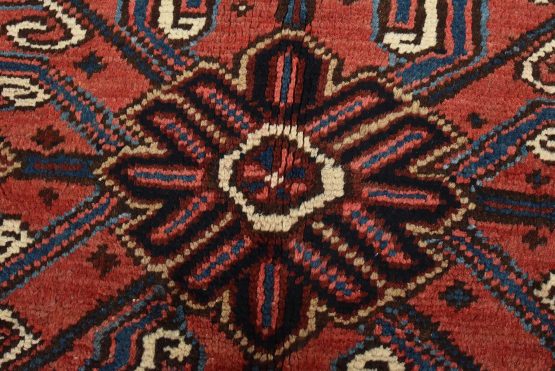 An authentic semi-antique tribal Heriz rug hand-knotted with fine wool and natural dyes. This nomadic oriental rug features a central geometric medallion surrounded by geometric botanical motifs set against a red background. The wool pile shows some minor wear; please refer to the photos. Otherwise, this rug is in very good condition.