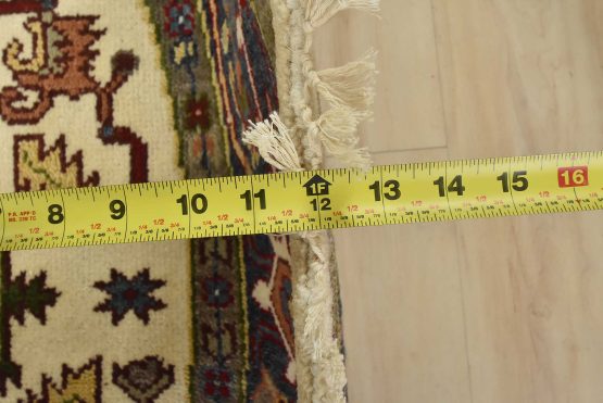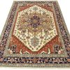 A traditional tribal Heriz rug hand-knotted with an all-wool pile on a cotton foundation. This oriental rug features a central geometric medallion surrounded by a geometric botanical design set against an ivory background. It is new and in excellent condition.