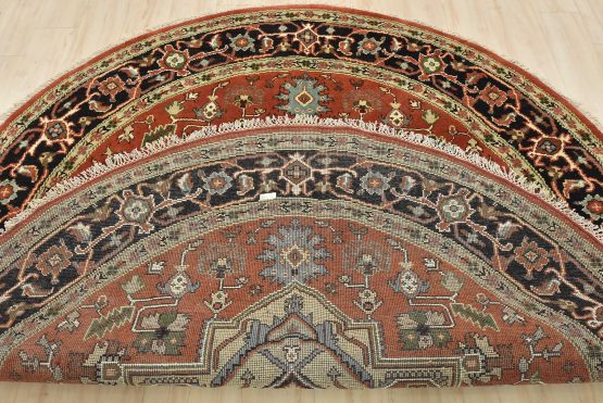A traditional tribal Heriz rug hand-knotted with an all-wool pile on a cotton foundation. This oriental rug features a large central medallion surrounded by geometric botanical motifs set against a rust-colored background. It is new and in excellent condition.