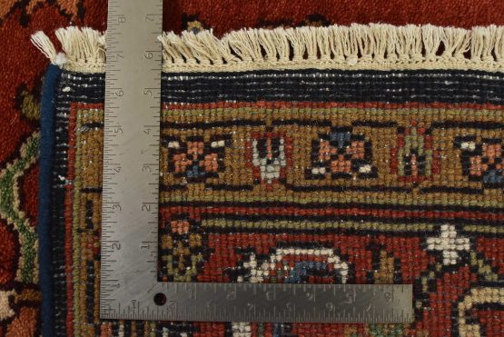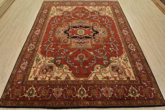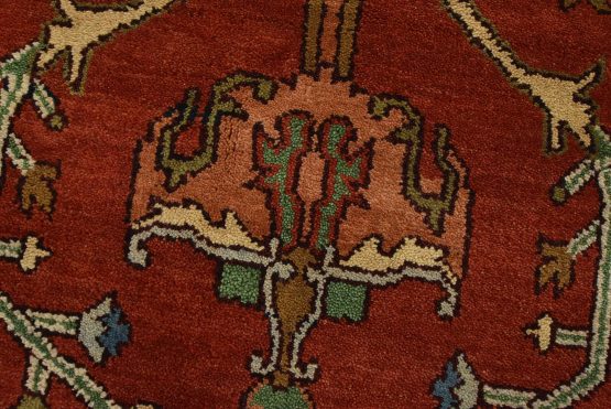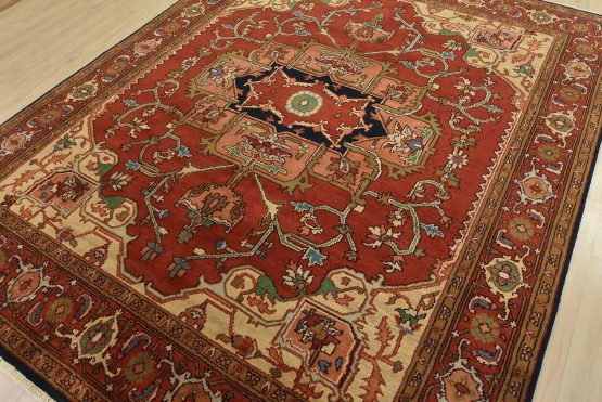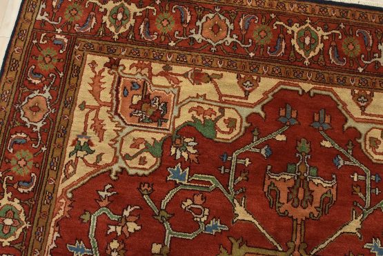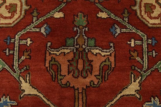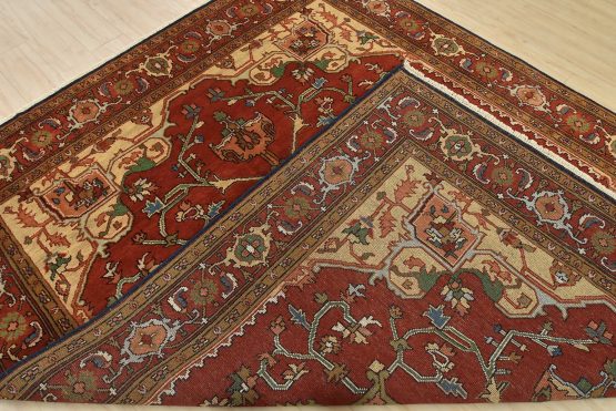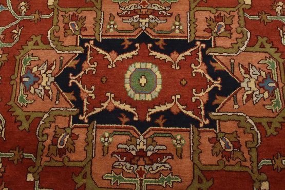 A traditional Heriz rug hand-knotted with an all-wool pile on a cotton foundation. This oriental rug features a central geometric medallion surrounded by a botanical design set against a red background. It is new and in excellent condition.