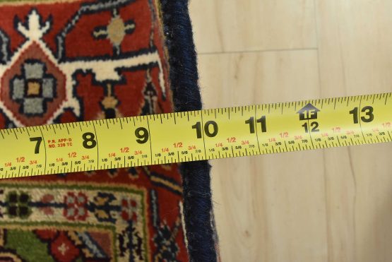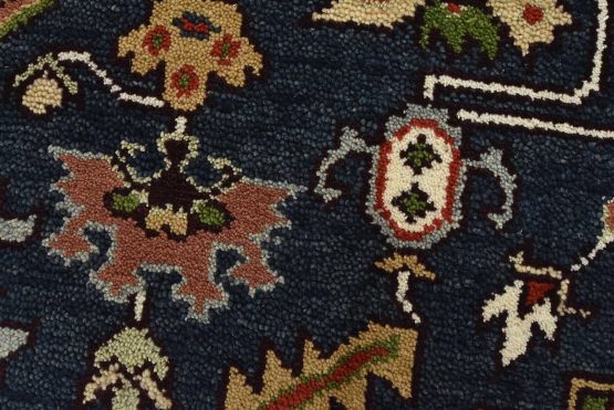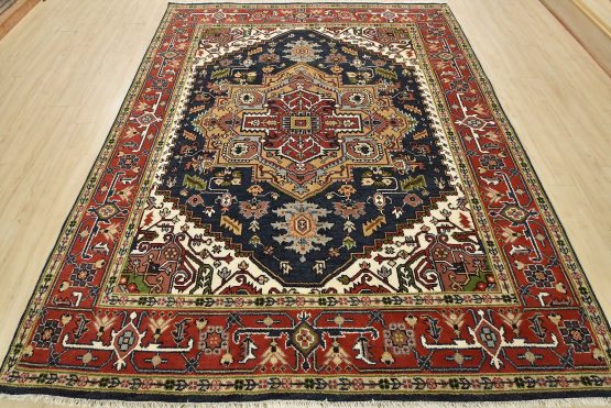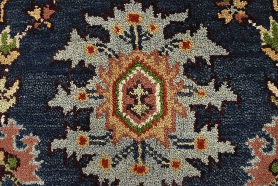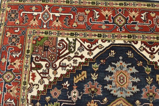 A traditional tribal Heriz rug hand-knotted with an all-wool pile on a cotton foundation. This oriental rug features a central medallion surrounded by a geometric botanical design set against a dark blue background. It is new and in excellent condition.