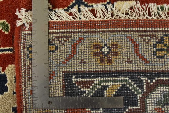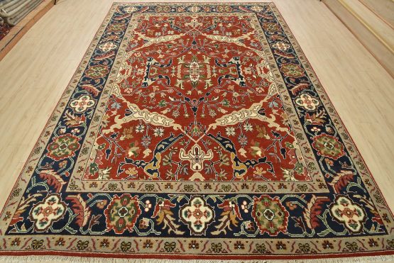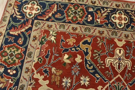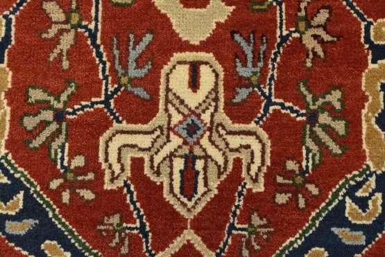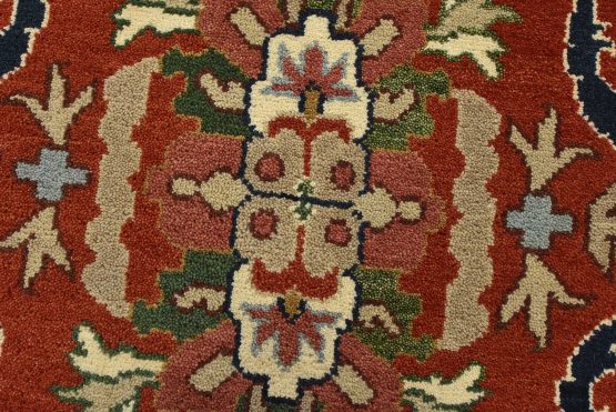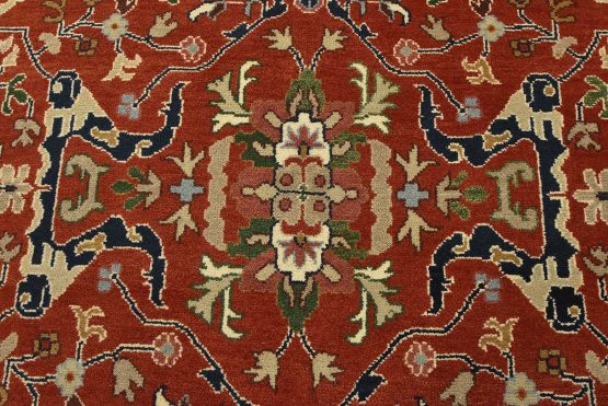 A traditional Heriz rug hand-knotted with an all-wool pile on a cotton foundation. This oriental rug features a central medallion surrounded by botanical designs set against a red background. It is new and in excellent condition.