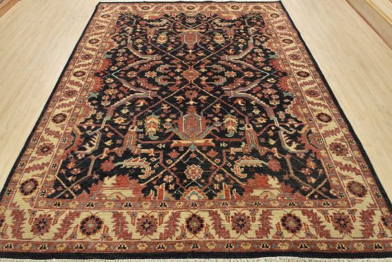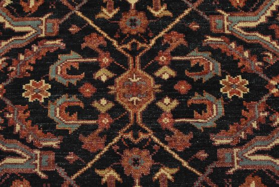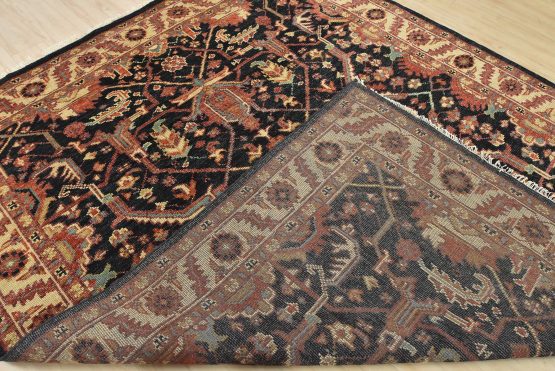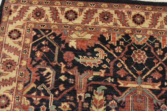 A traditional Heriz rug hand-knotted with an all-wool pile on a cotton foundation. This oriental rug features an all-over botanical design set against a dark blue background. It is new and in excellent condition.