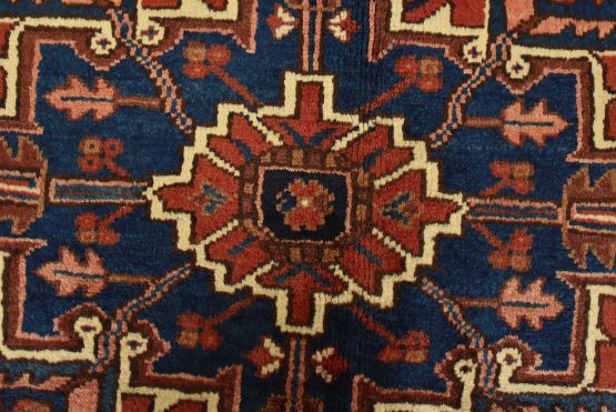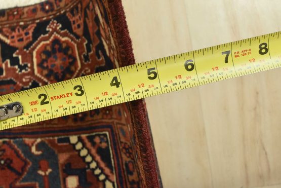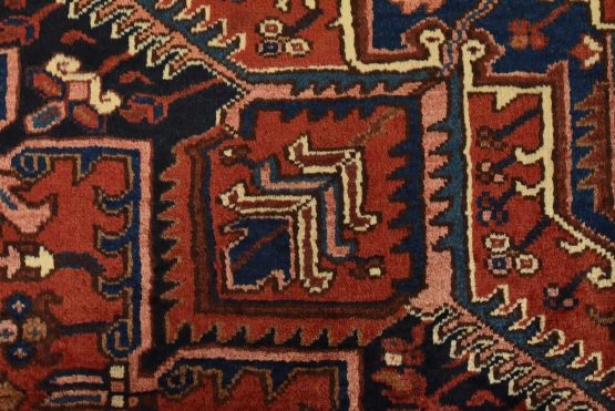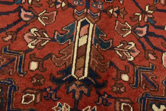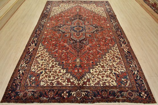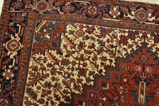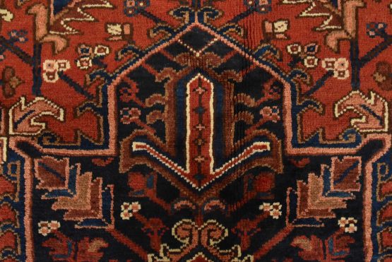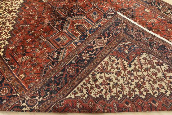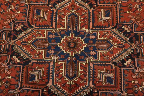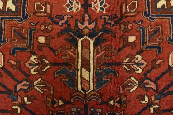 An authentic vintage traditional Heriz rug hand-knotted with an all-wool pile on a cotton foundation. This rug features a large central medallion surrounded by geometric floral designs set against a red background. It has a full pile with no worn areas and is in very good condition.