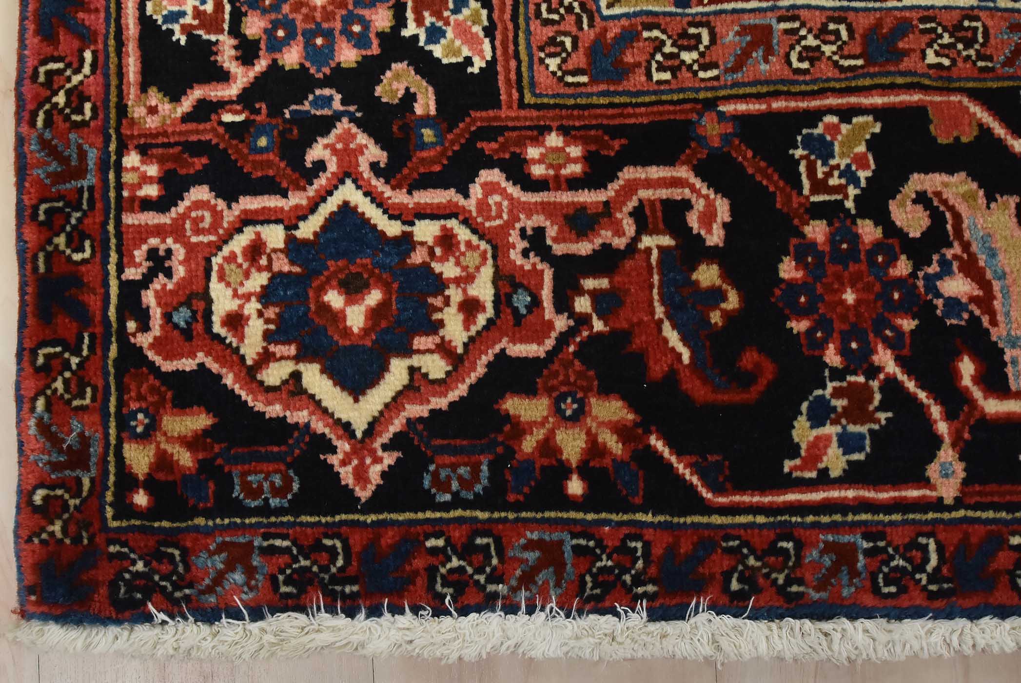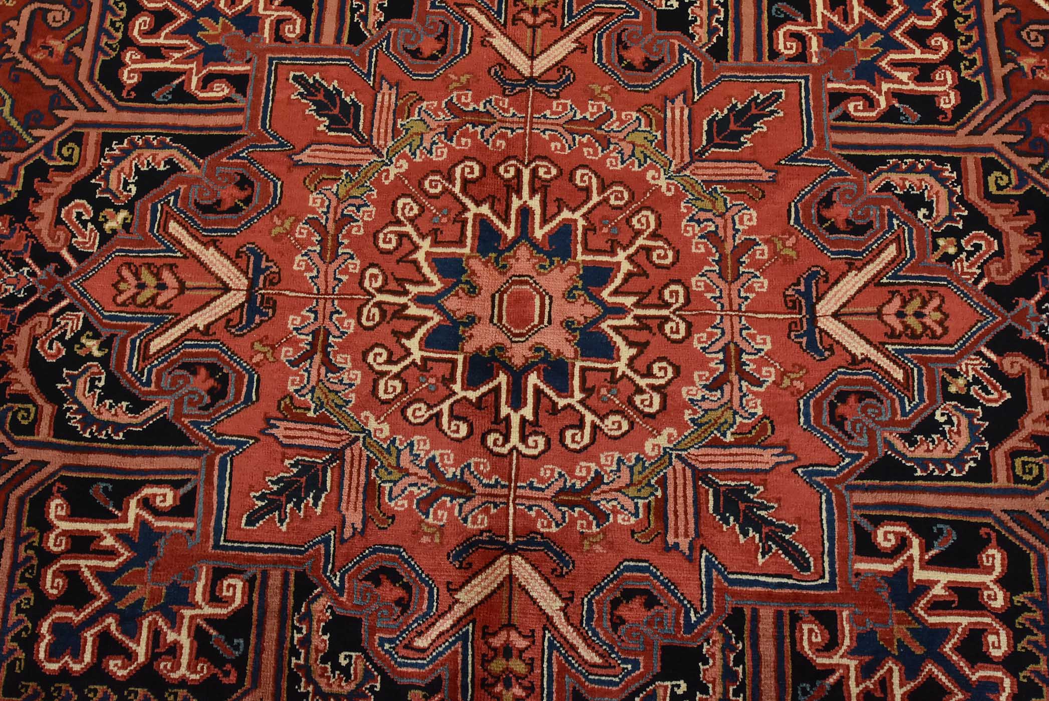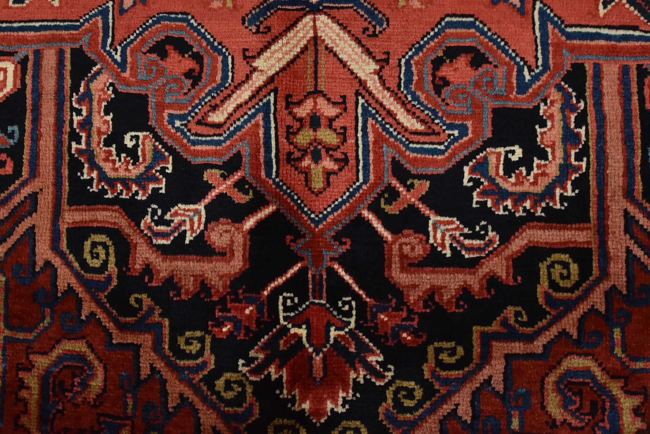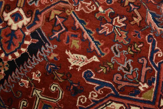 An authentic vintage traditional tribal Heriz rug hand-knotted with fine wool and natural dyes. This area rug features a central geometric medallion surrounded by a botanical design with bird figures set against a blue background. It has a full wool pile with no worn areas and is in very good condition.