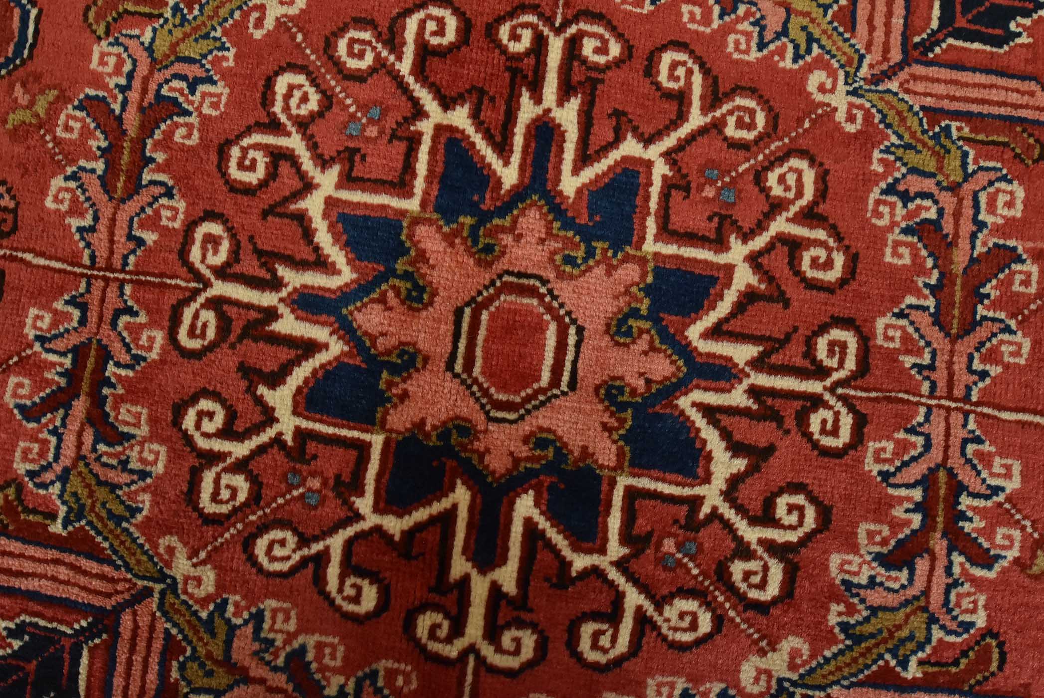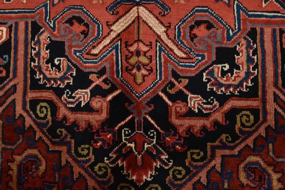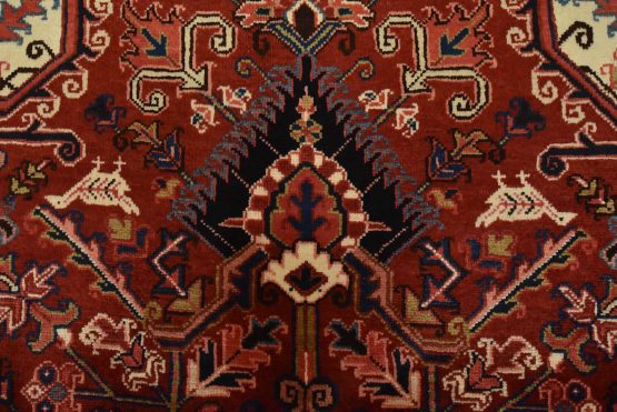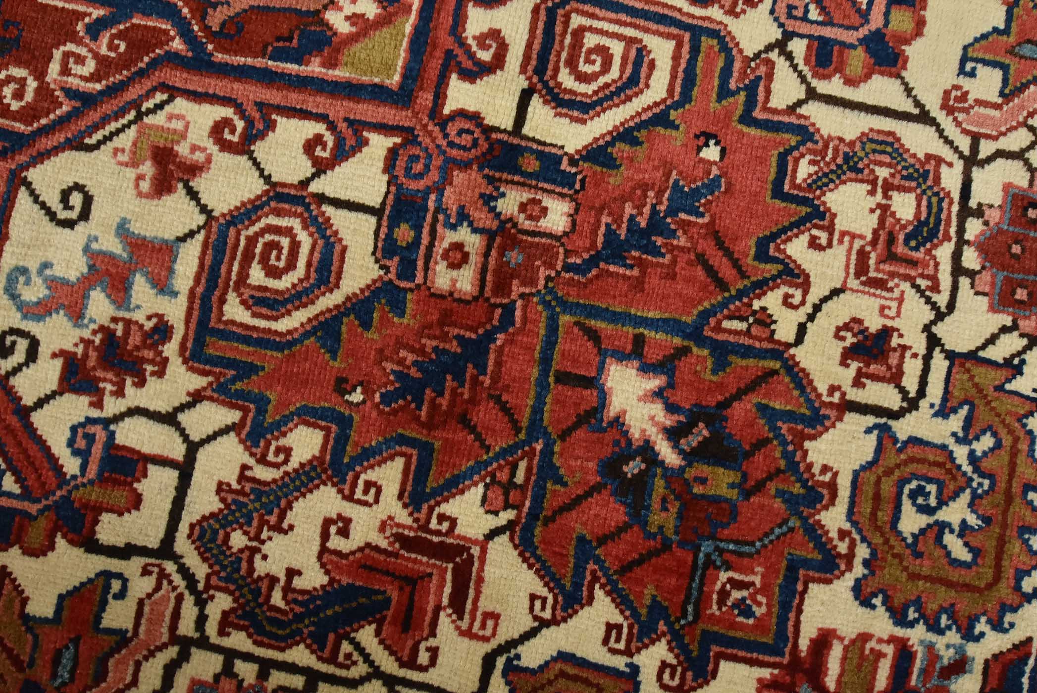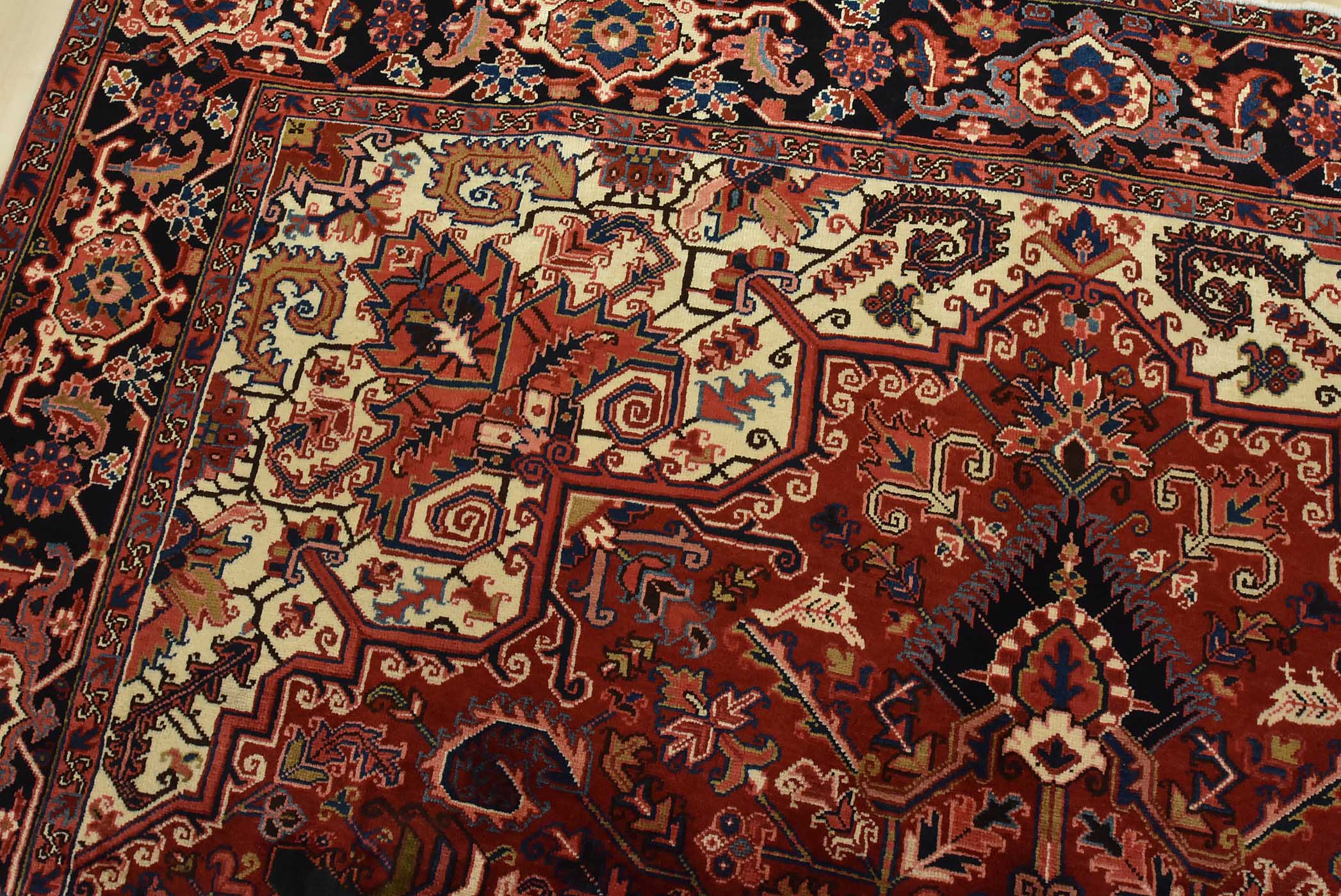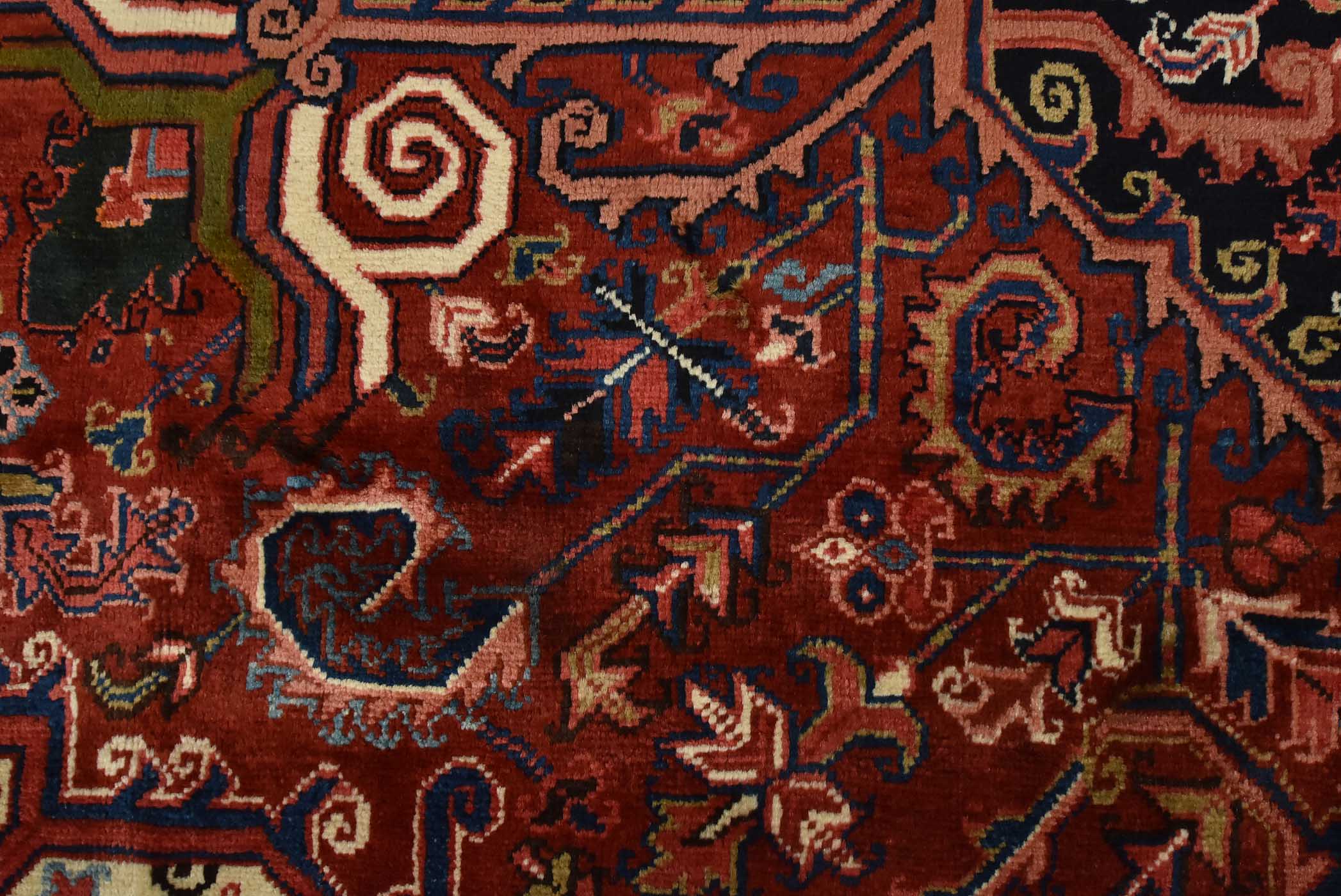 An authentic vintage traditional tribal Heriz rug hand-knotted with fine wool and natural dyes. This area rug features a central geometric medallion surrounded by a botanical design with bird figures set against a blue background. It has a full wool pile with no worn areas and is in very good condition.