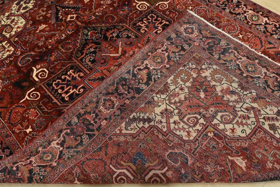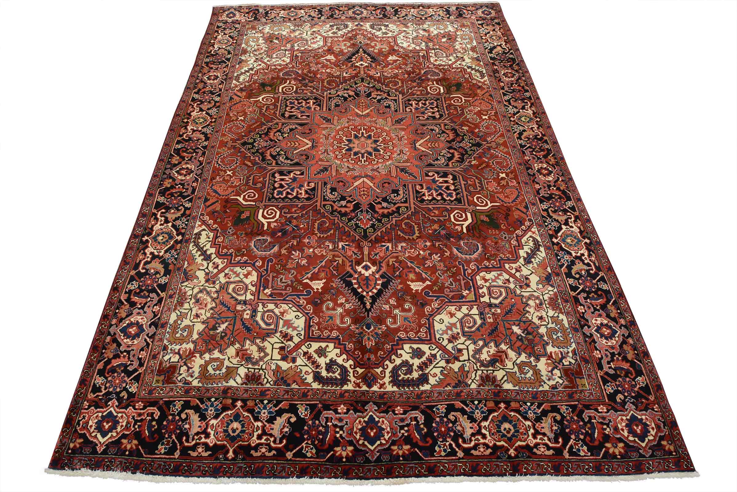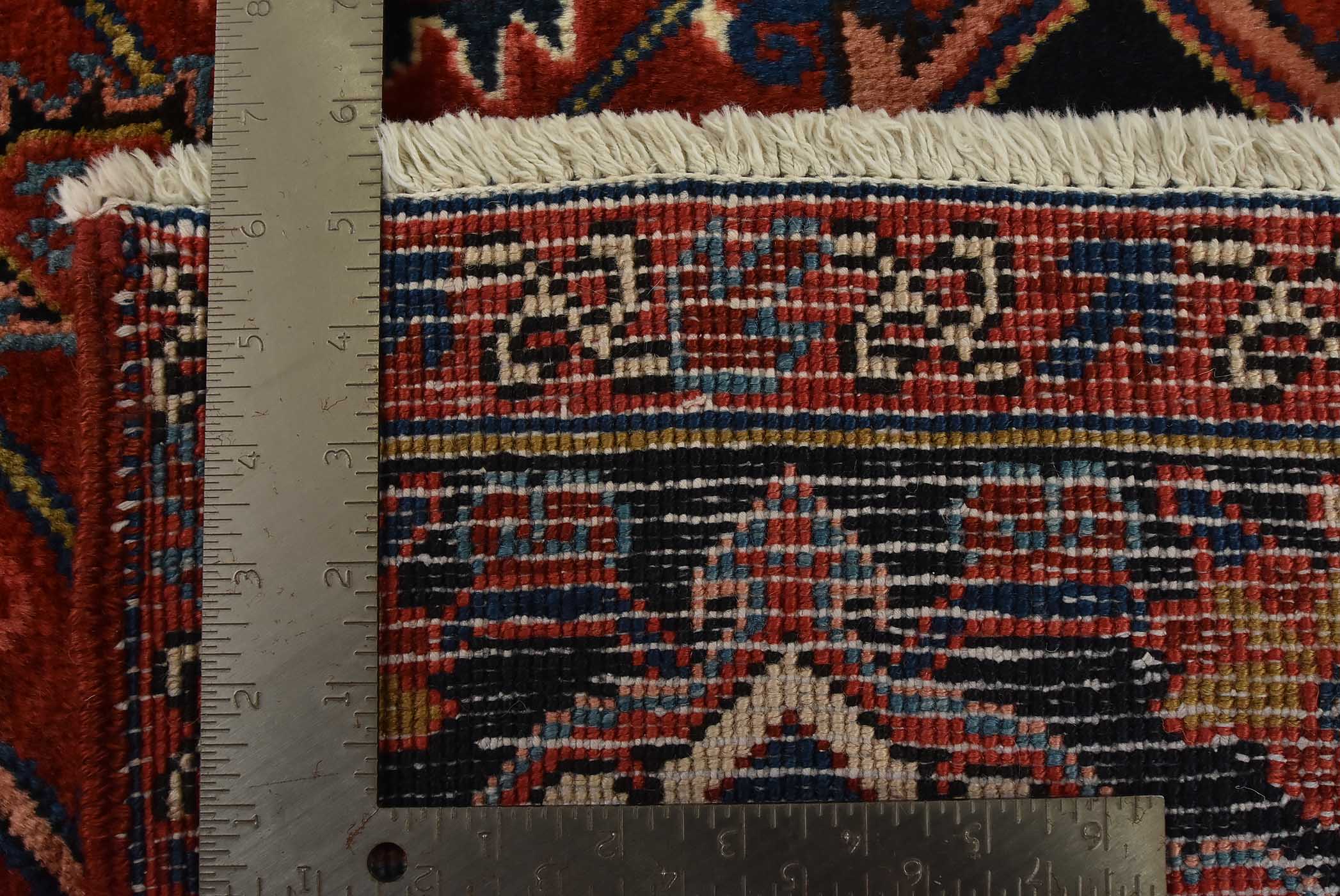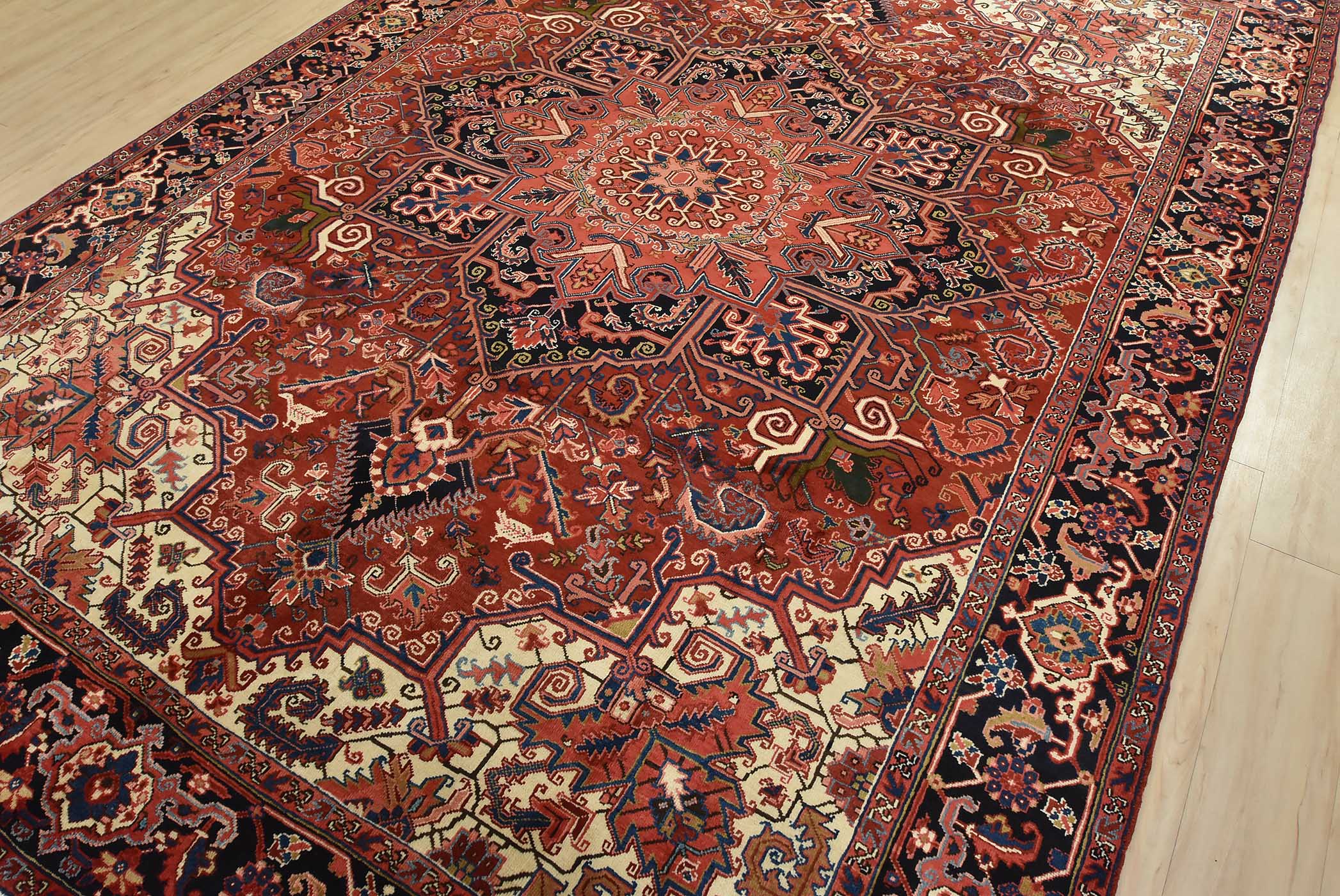 An authentic vintage traditional tribal Heriz rug hand-knotted with fine wool and natural dyes. This area rug features a central geometric medallion surrounded by a botanical design with bird figures set against a blue background. It has a full wool pile with no worn areas and is in very good condition.
