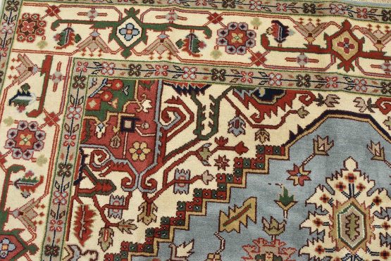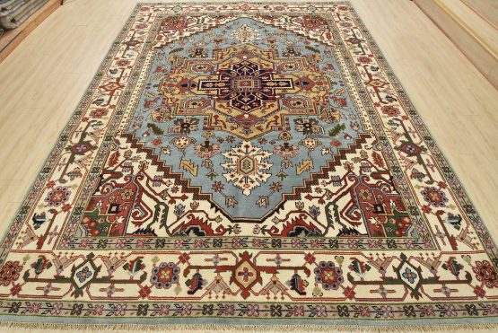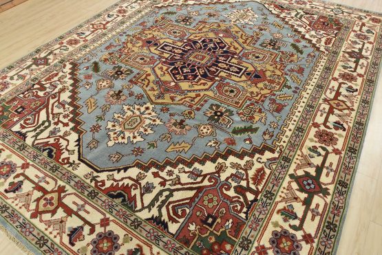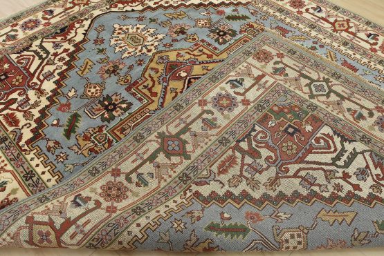 A traditional tribal Heriz rug hand-knotted with an all-wool pile on a cotton foundation. This oriental rug features a large central medallion surrounded by geometric botanical motifs set against a light blue background. It is new and in excellent condition.