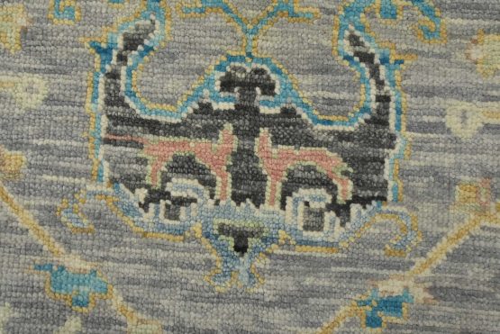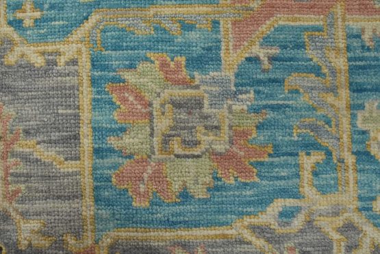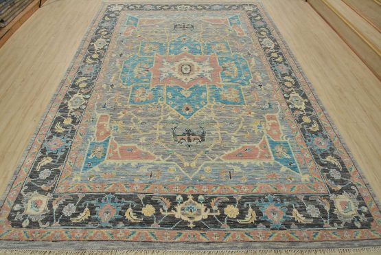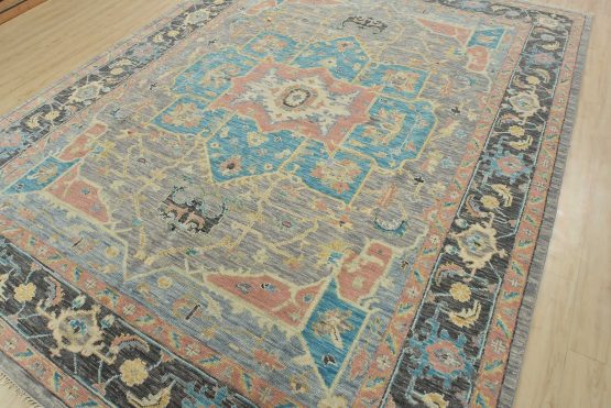 A modern traditional Heriz rug hand-knotted with an all-wool pile on a cotton foundation. This oriental rug features a central geometric medallion surrounded by botanical designs set against a gray background. It is new and in excellent condition.