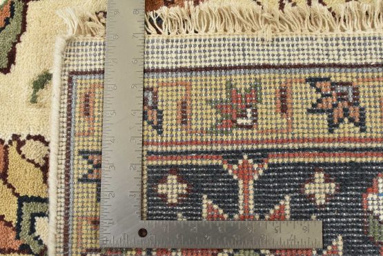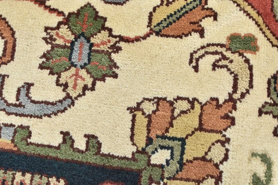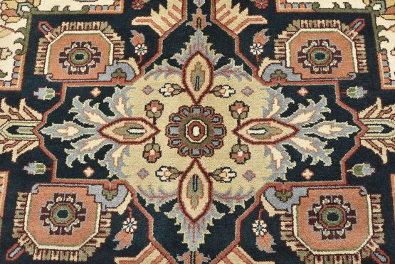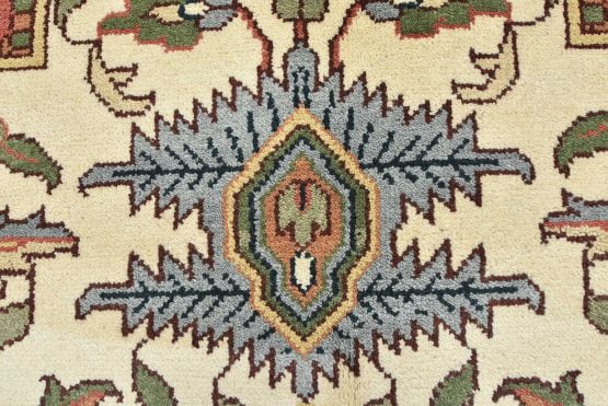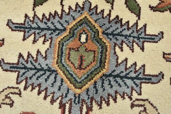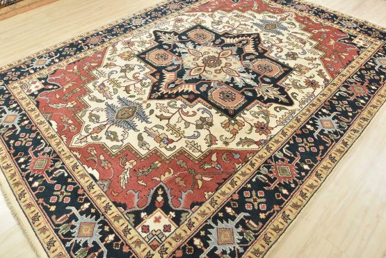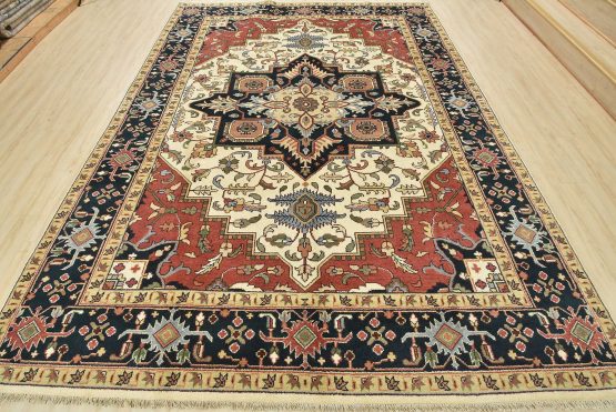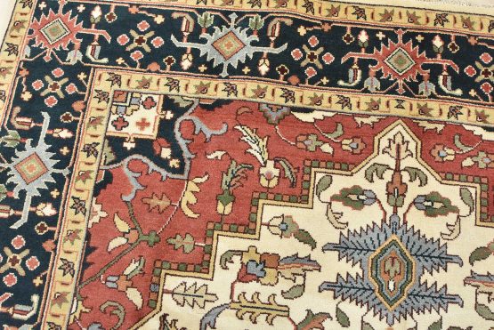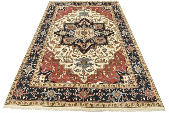 A traditional Heriz rug hand-knotted with an all-wool pile on a cotton foundation. This oriental rug features a geometric medallion surrounded by botanical designs set against an ivory background. It is new and in excellent condition.