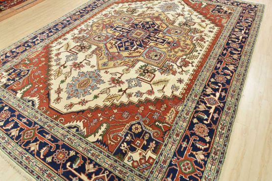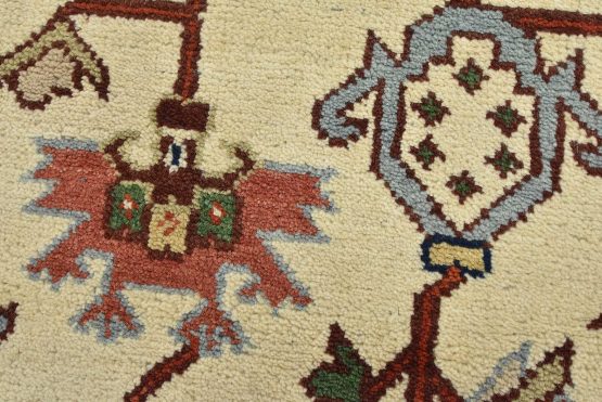 A traditional tribal Heriz rug hand-knotted with an all-wool pile on a cotton foundation. This oriental rug features a large central medallion surrounded by a geometric botanical design set against an ivory background. It is new and in excellent condition.