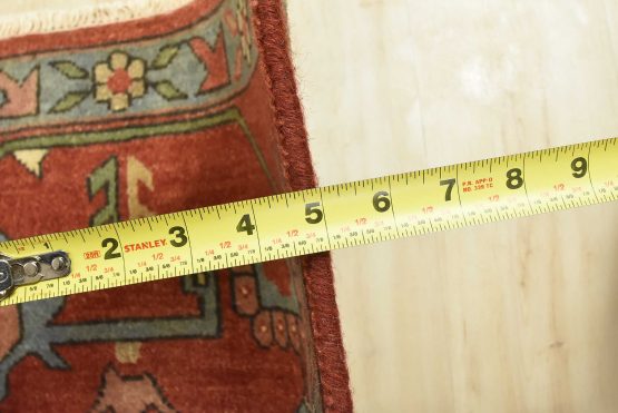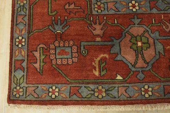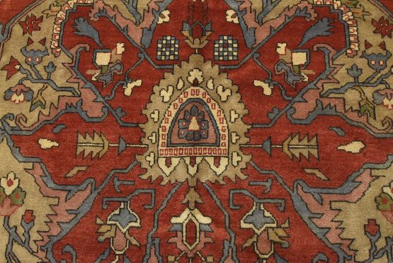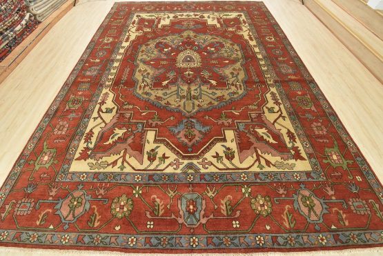 A traditional tribal Heriz rug hand-knotted with an all-wool pile on a cotton foundation. This oriental rug features a large central medallion surrounded by a geometric botanical design set against a rust-red background. It is new and in excellent condition.