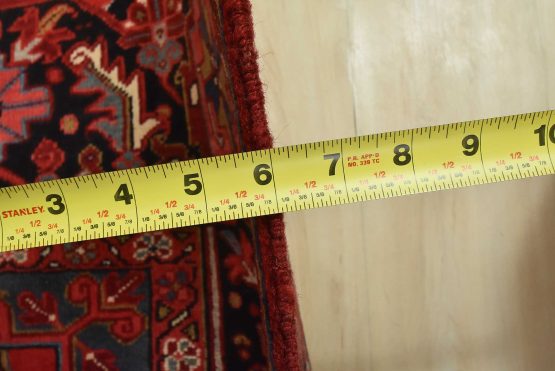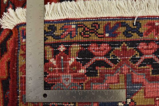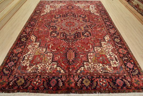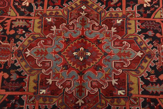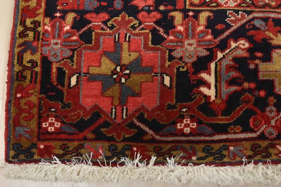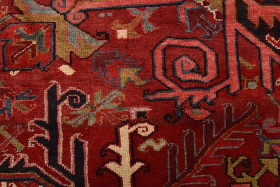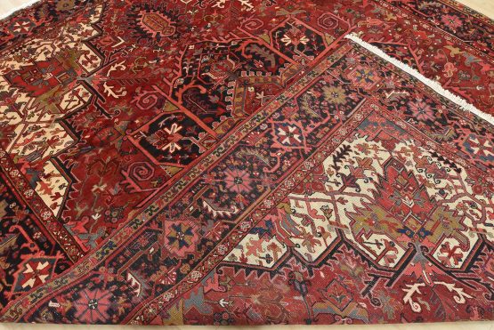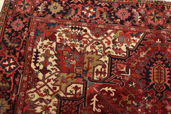 An authentic vintage traditional Heriz rug hand-knotted with fine wool and natural dyes. This oriental rug features a large central medallion surrounded by botanical motifs set against a red background. It has a full wool pile with no worn areas and is in very good condition.