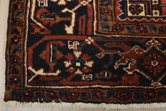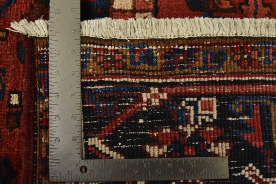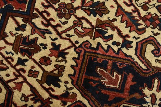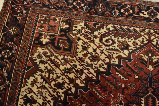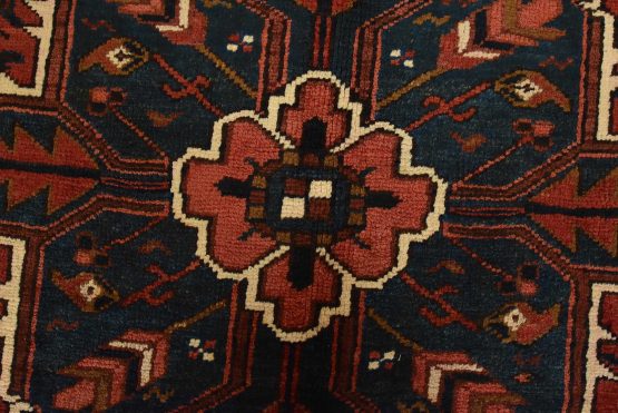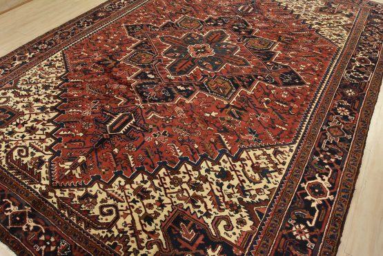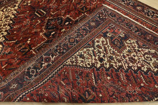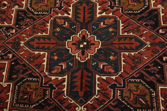 An authentic vintage traditional tribal Heriz rug hand-knotted with fine wool and natural dyes. This oriental rug features a central geometric medallion surrounded by botanical designs set against a red background. It has a full wool pile with no worn areas and is in very good condition.