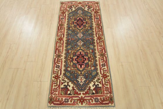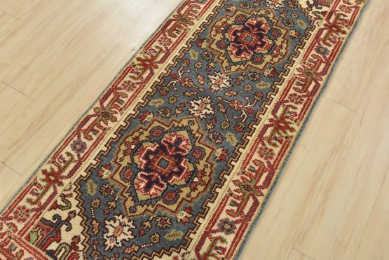 A traditional tribal Heriz runner hand-knotted with an all-wool pile on a cotton foundation. This oriental rug features geometric medallions surrounded by a botanical design set against a blue background. It is new and in excellent condition.