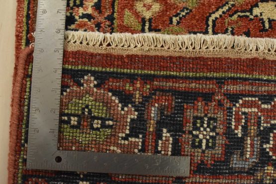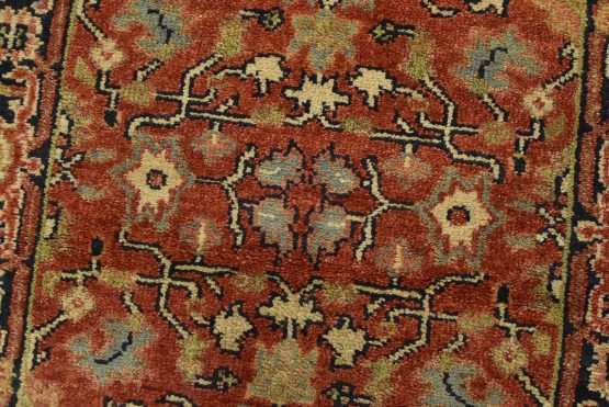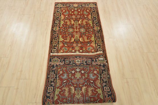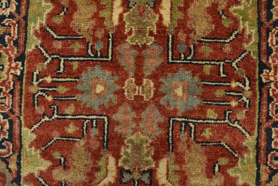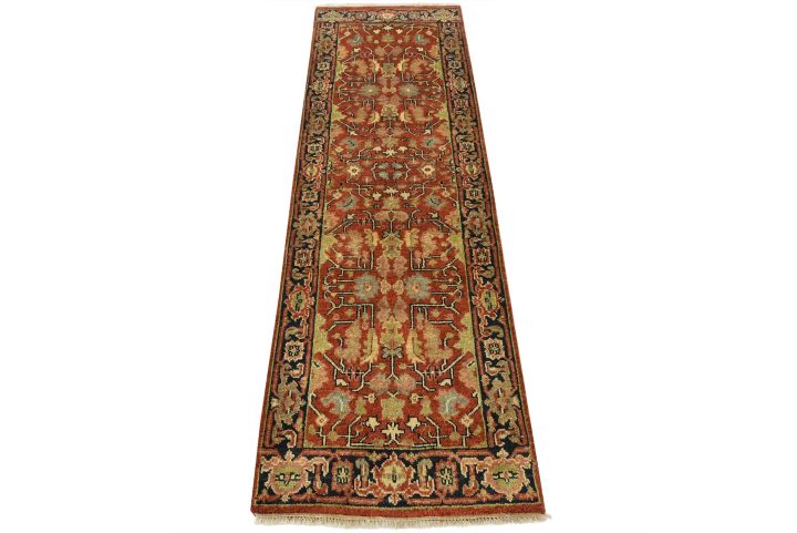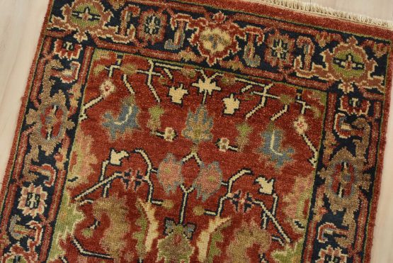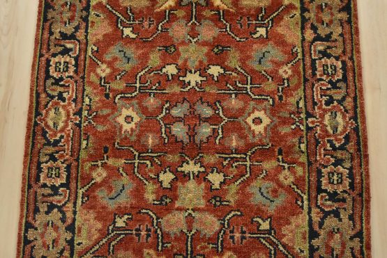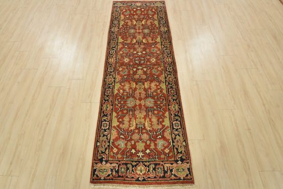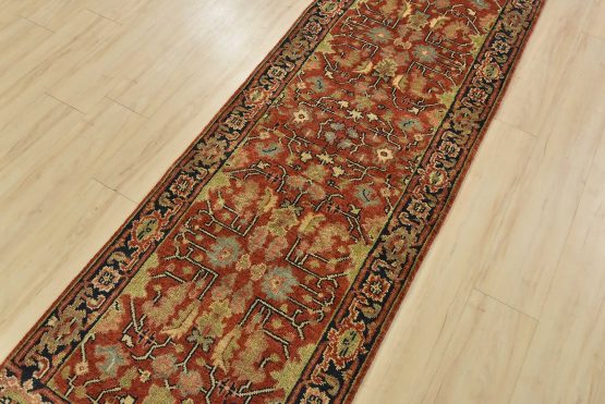 A traditional Heriz runner hand-knotted with an all-wool pile on a cotton foundation. This oriental rug features a botanical design set against a red background. It is new and in excellent condition.