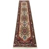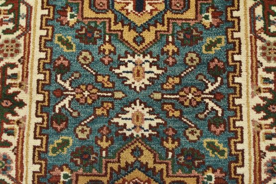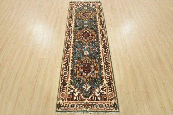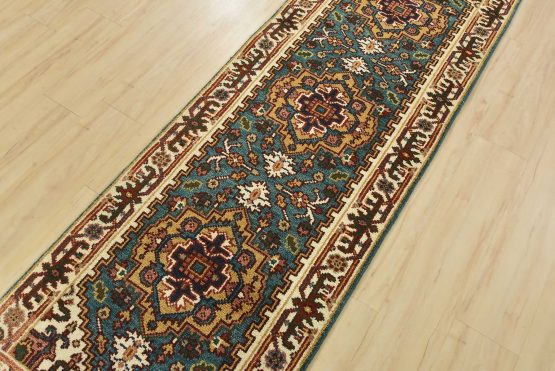 A traditional tribal Heriz runner hand-knotted with an all-wool pile on a cotton foundation. This oriental rug features geometric medallions surrounded by a botanical design set against a blue background. It is new and in excellent condition.