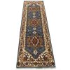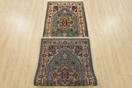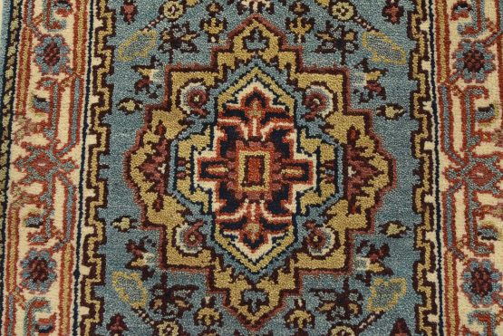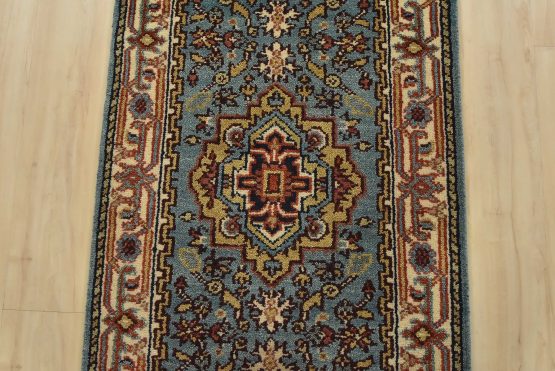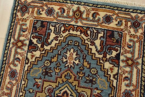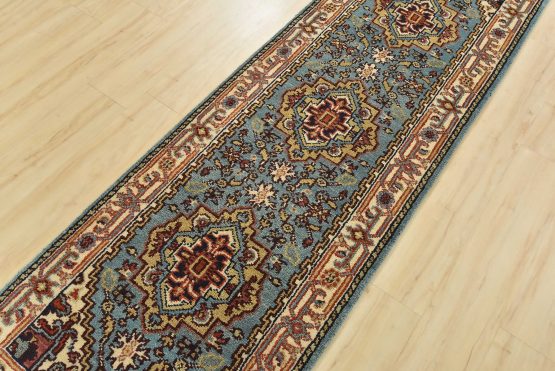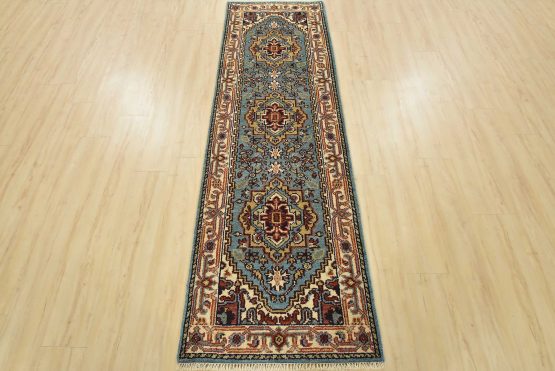 A traditional tribal Heriz runner hand-knotted with an all-wool pile on a cotton foundation. This oriental rug features geometric medallions surrounded by a botanical design set against a light blue background. It is new and in excellent condition.