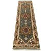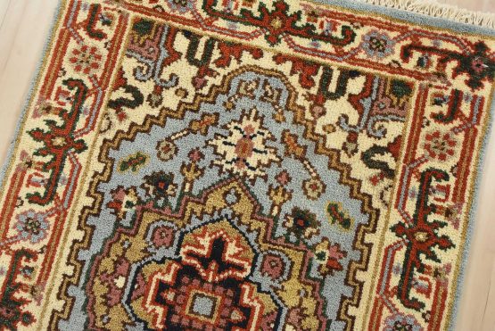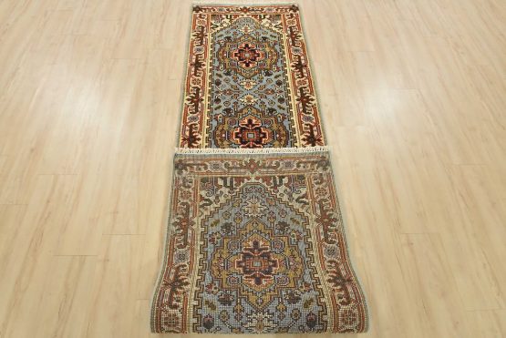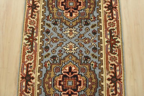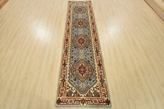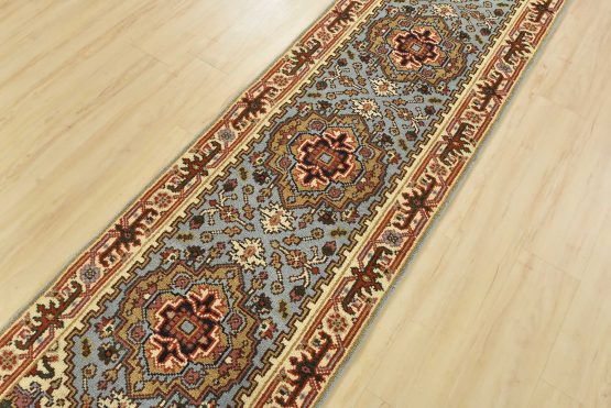 A traditional tribal Heriz runner hand-knotted with an all-wool pile on a cotton foundation. This oriental rug features geometric medallions surrounded by a botanical design set against a light blue background. It is new and in excellent condition.