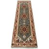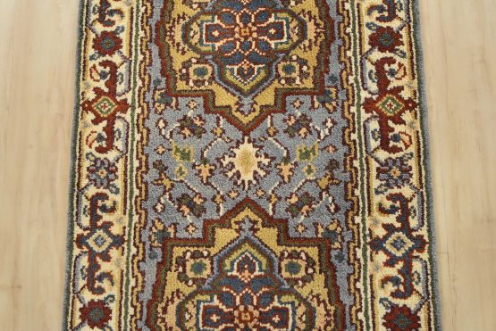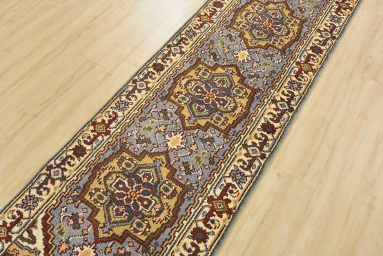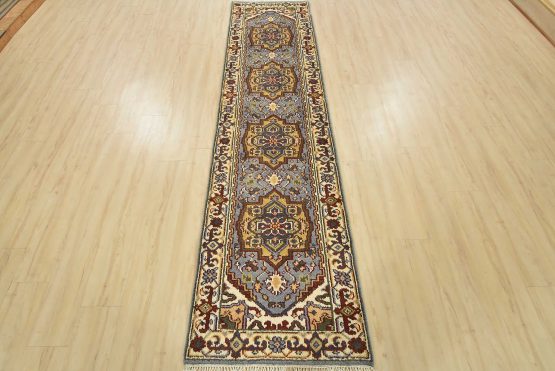 A traditional tribal Heriz runner hand-knotted with an all-wool pile on a cotton foundation. This oriental rug features geometric medallions surrounded by a botanical design set against a light blue background. It is new and in excellent condition.