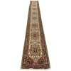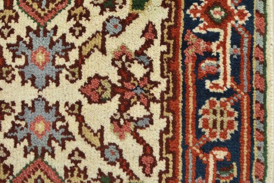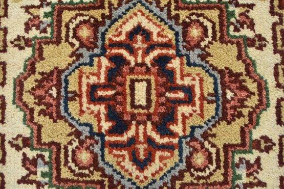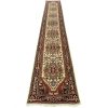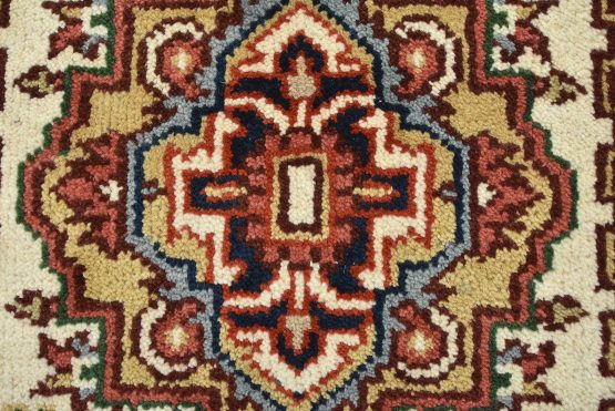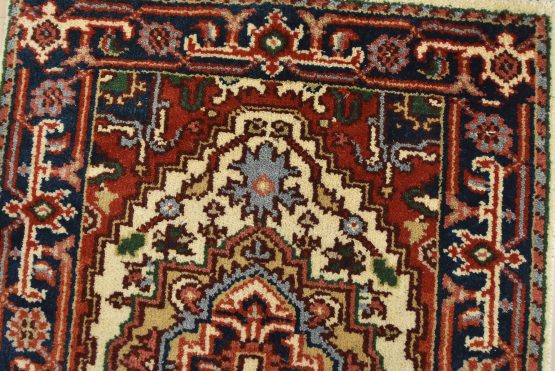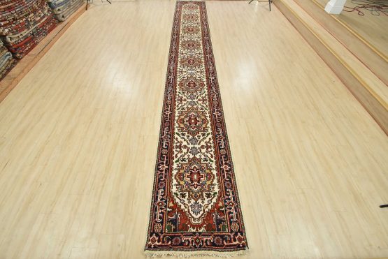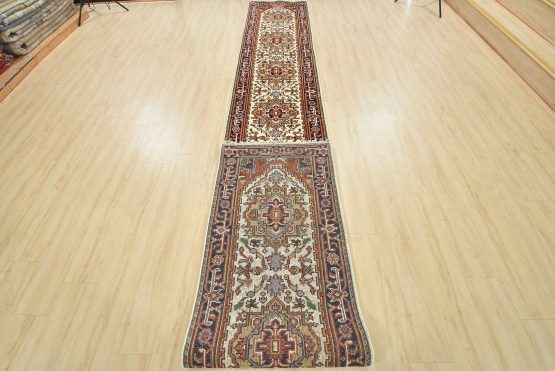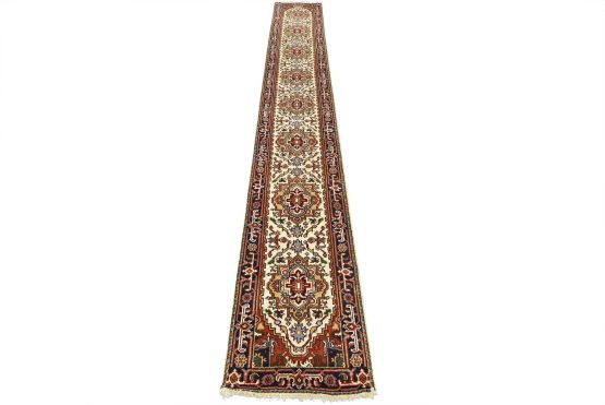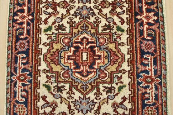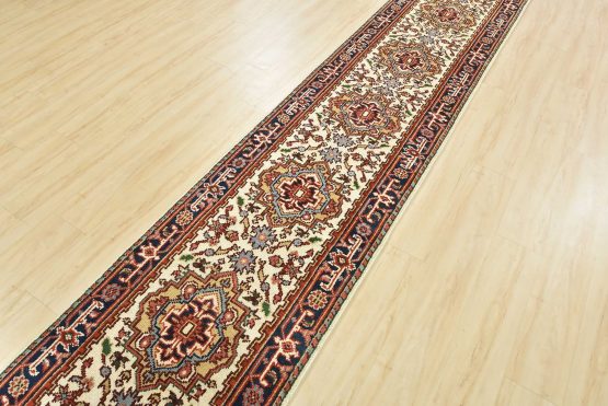 A traditional tribal Heriz runner hand-knotted with an all-wool pile on a cotton foundation. This oriental rug features a row of geometric medallions surrounded by a botanical design set against an ivory background. It is new and in excellent condition.