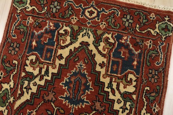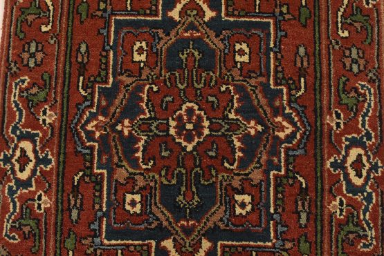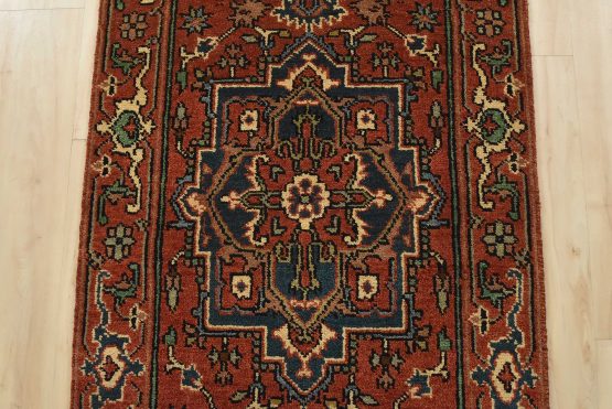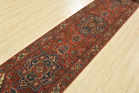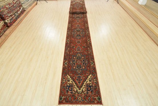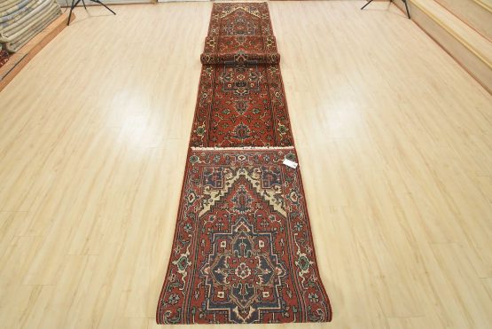A traditional tribal Heriz runner hand-knotted with an all-wool pile on a cotton foundation. This oriental rug features a row of geometric medallions surrounded by a botanical design set against a rust-red background. It is new and in excellent condition.