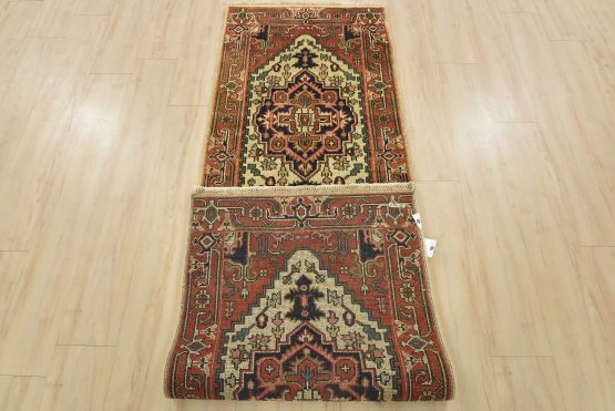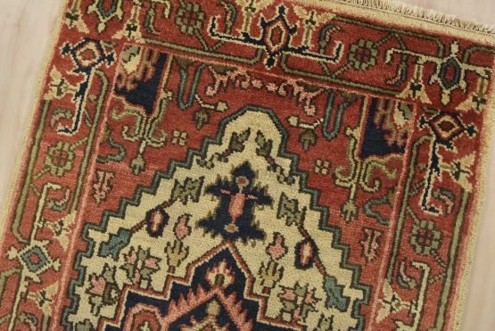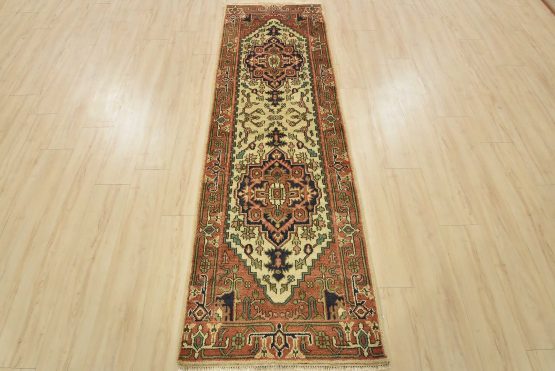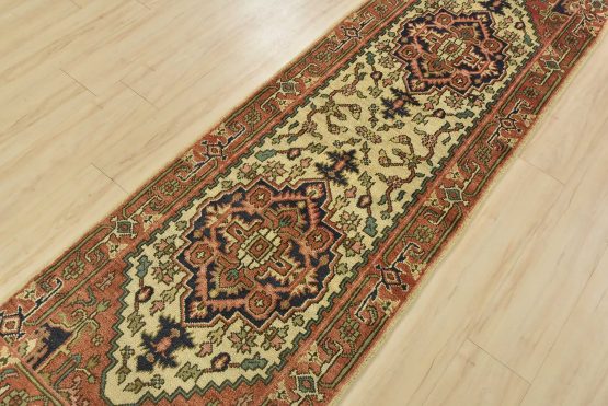 A traditional tribal Heriz runner hand-knotted with an all-wool pile on a cotton foundation. This oriental rug features geometric medallions surrounded by a botanical design set against an ivory background. It is new and in excellent condition.