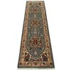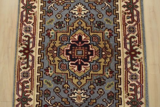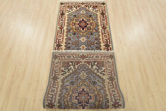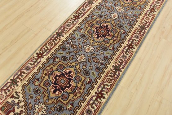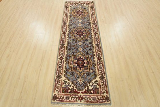 A traditional tribal Heriz runner hand-knotted with an all-wool pile on a cotton foundation. This oriental rug features geometric medallions surrounded by a botanical design set against a light blue background. It is new and in excellent condition.