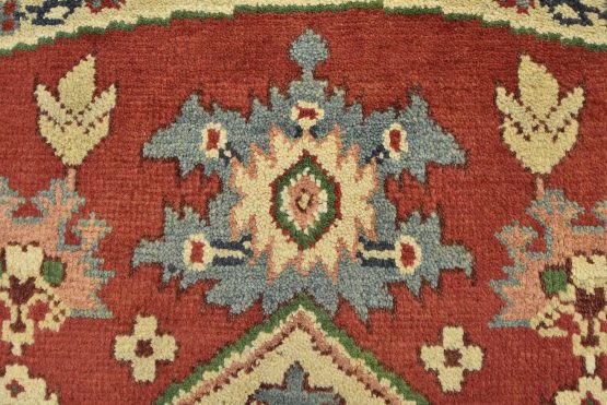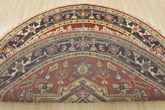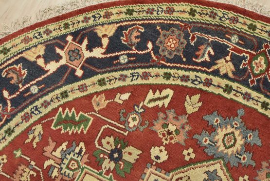 A traditional tribal Heriz rug hand-knotted with an all-wool pile on a cotton foundation. This oriental rug features a large central medallion surrounded by geometric botanical motifs set against a red background. It is new and in excellent condition.